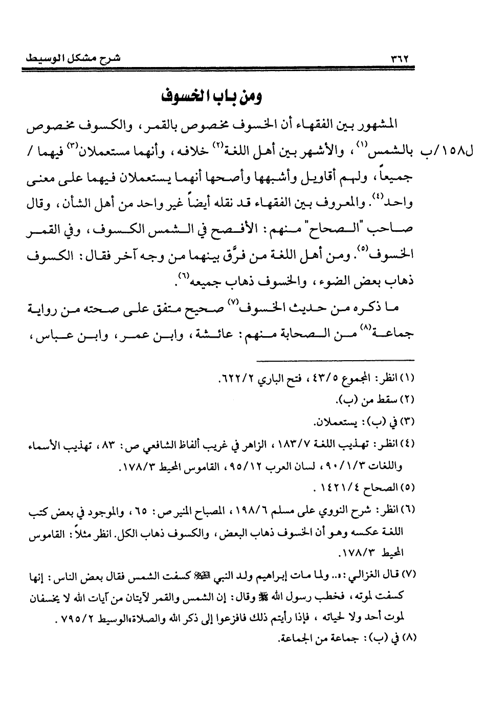 (¬6) انظر: شرح النووي على مسلم 6/ 198، المصباح المنير ص: 65، والموجود في بعض كتب اللغة عكسه وهو أن الخسوف ذهاب البعض، والكسوف ذهاب الكل. انظر مثلاً: القاموس المحيط 3/ 178.