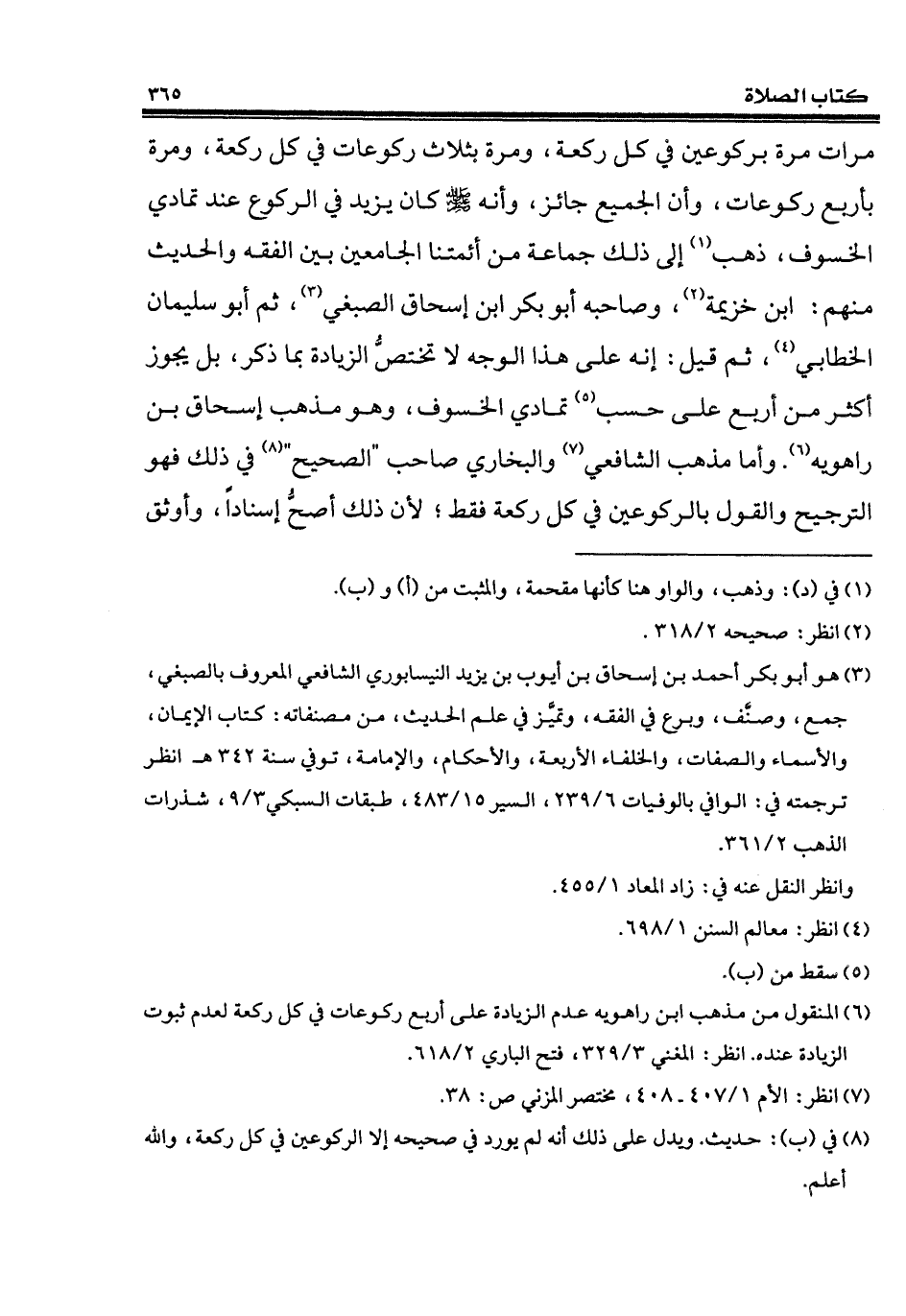 (¬6) المنقول من مذهب ابن راهويه عدم الزيادة على أربع ركوعات في كل ركعة لعدم ثبوت الزيادة عنده. انظر: المغني 3/ 329، فتح الباري 2/ 618.