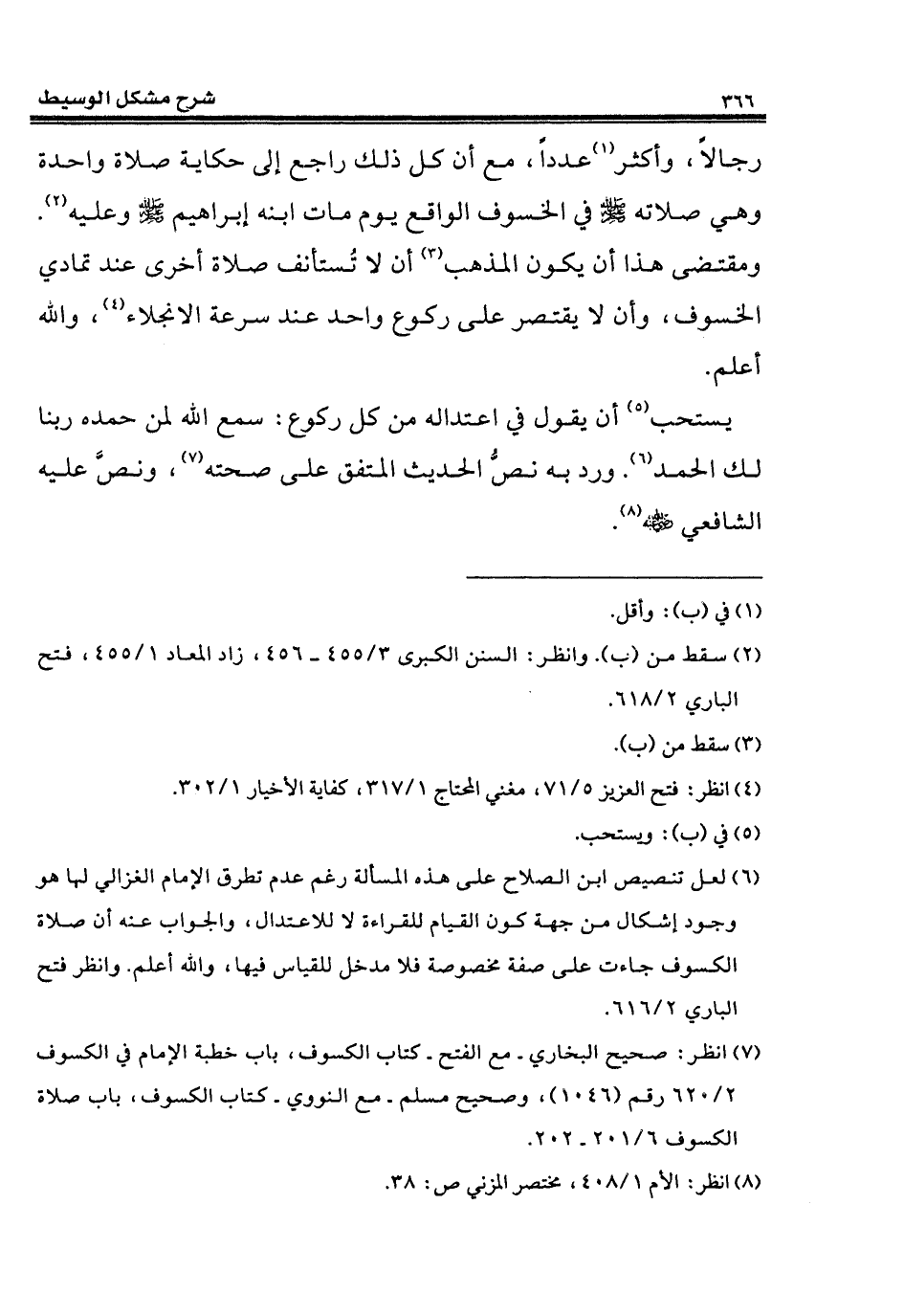 (¬6) لعل تنصيص ابن الصلاح على هذه المسألة رغم عدم تطرق الإمام الغزالي لها هو وجود إشكال من جهة كون القيام للقراءة لا للاعتدال، والجواب عنه أن صلاة الكسوف جاءت على صفة مخصوصة فلا مدخل للقياس فيها، والله أعلم. وانظر فتح الباري 2/ 616.