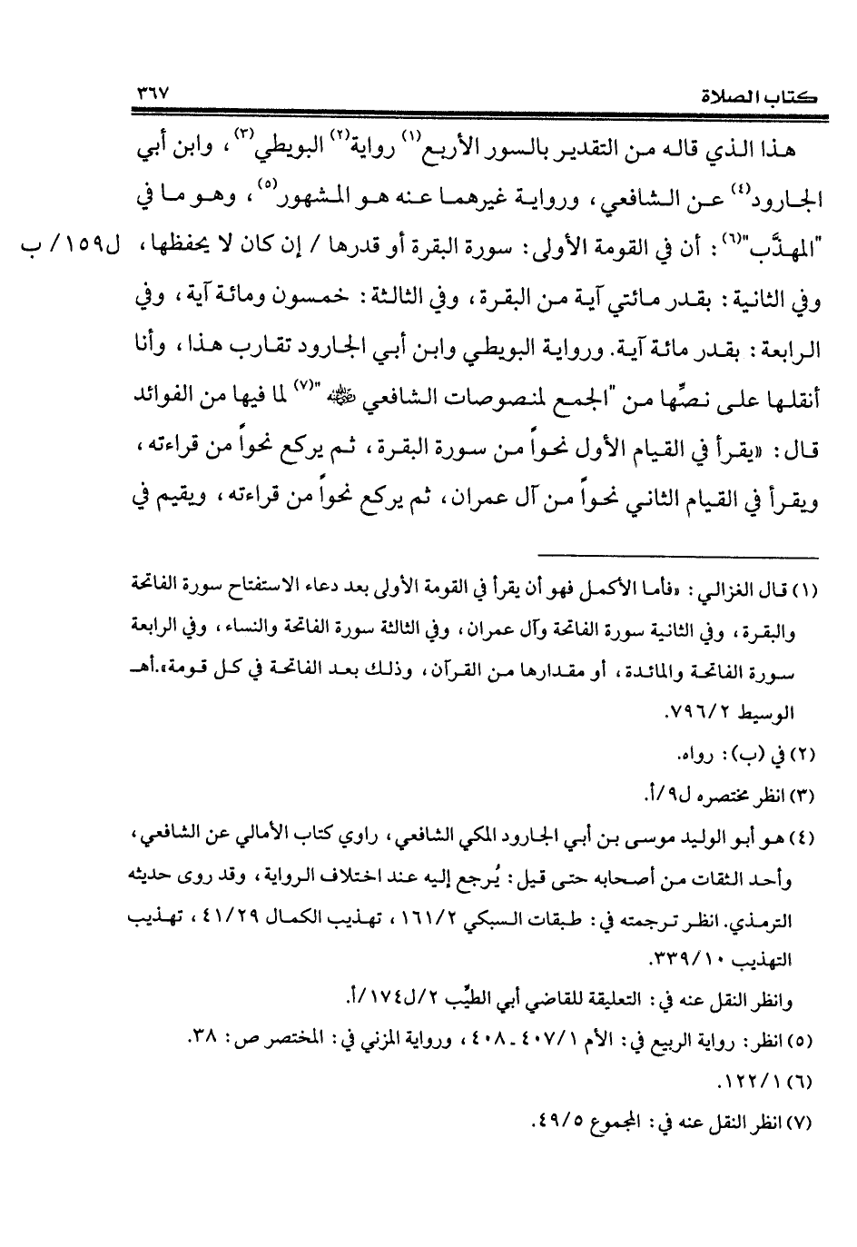 هذا الذي قاله من التقدير بالسور الأربع (¬1) رواية (¬2) البويطي (¬3)، وابن أبي الجارود (¬4) عن الشافعي، ورواية غيرهما عنه هو المشهور (¬5)، وهو ما في "المهذَّب" (¬6): أن في القومة الأولى: سورة البقرة أو قدرها إن كان لا يحفظها، وفي الثانية: بقدر مائتي آية من البقرة، وفي الثالثة: خمسون ومائة آية، وفي الرابعة: بقدر مائة آية. ورواية البويطي وابن أبي الجارود تقارب هذا، وأنا أنقلها على نصِّها من "الجمع لمنصوصات الشافعي - رضي الله عنه -" (¬7) لما فيها من الفوائد قال: "يقول في القيام الأول نحواً من سورة البقرة، ثم يركع نحواً من قراءته، ويقرأ في القيام الثاني نحواً من آل عمران، ثم يركع نحواً من قراءته، ويقيم في