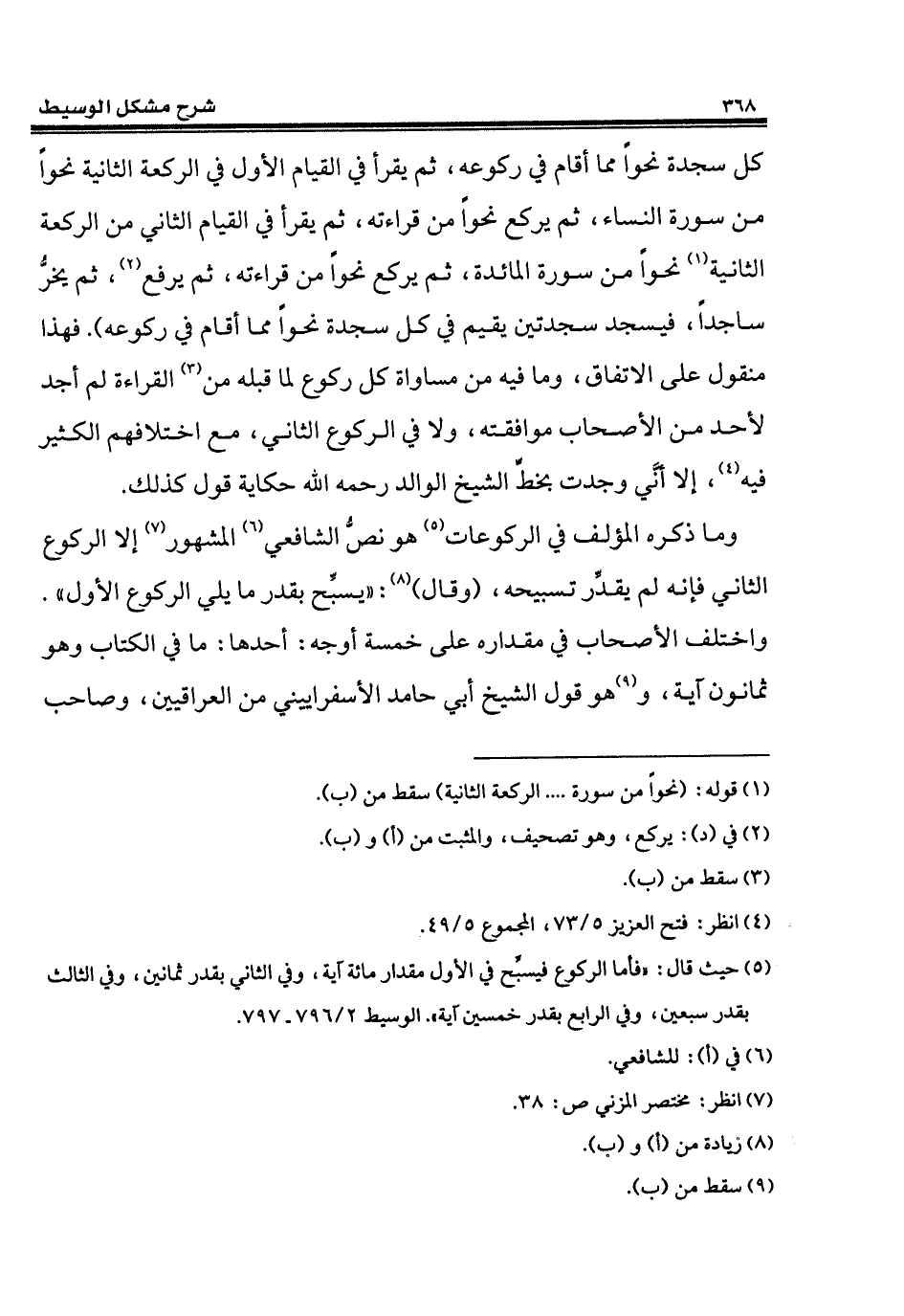 كل سجدة نحواً مما أقام في ركوعه، ثم يقرأ في القيام الأول في الركعة الثانية نحواً من سورة النساء، ثم يركع نحواً من قراءته، ثم يقرأ في القيام الثاني من الركعة الثانية (¬1) نحواً من سورة المائدة، ثم يركع نحواً من قراءته، ثم يرفع (¬2)، ثم يخرُّ ساجداً، فيسجد سجدتين يقيم في كل سجدة نحواً مما أقام في ركوعه). فهذا منقول على الاتفاق، وما فيه من مساواة كل ركوع لما قبله من (¬3) القراءة لم أجد لأحد من الأصحاب موافقته، ولا في الركوع الثاني، مع اختلافهم الكثير فيه (¬4)، إلا أني وجدت بخطَّ الشيخ الوالد رحمه الله حكاية قول كذلك.