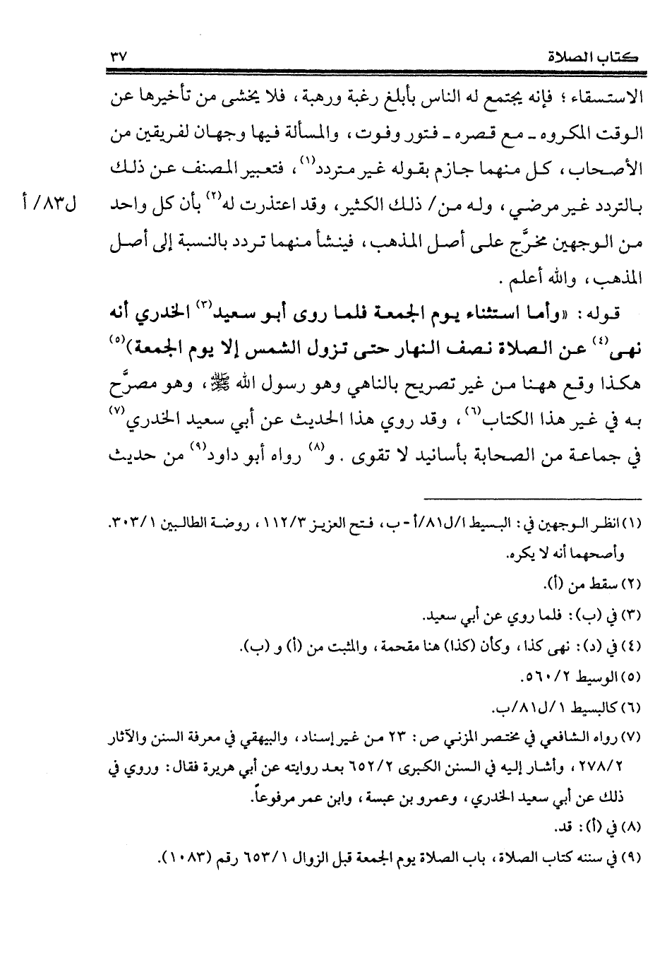 (¬9) في سننه كتاب الصلاة، باب الصلاة يوم الجمعة قبل الزوال 1/ 653 رقم (1083).
