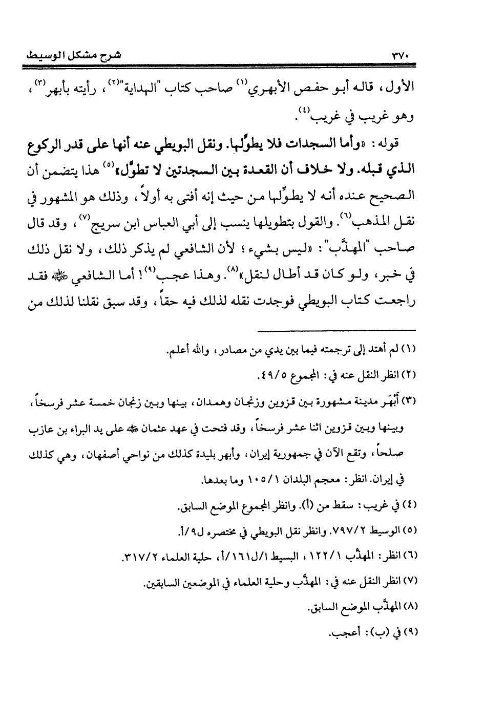قوله: "وأما السجدات فلا يطوَّلها. ونقل البويطي عنه أنها على قدر الركوع الذي قبله. ولا خلاف أن القعدة بين السجدتين لا تطوَّل" (¬5) هذا يتضمن أن الصحيح عنده أنه لا يطوِّلها من حيث إنه أفتى به أولاً، وذلك هو المشهور في نقل المذهب (¬6). والقول بتطويلها ينسب إلى أبي العباس ابن سريج (¬7)، وقد قال صاحب "المهذَّب": "ليس بشيء؛ لأن الشافعي لم يذكر ذلك، ولا نقل ذلك في خبر، ولو كان قد أطال لنقل" (¬8). وهذا عجب (¬9)! أما الشافعي - رضي الله عنه - فقد راجعت كتاب البويطي فوجدت نقله لذلك فيه حقاً، وقد سبق نقلنا لذلك من