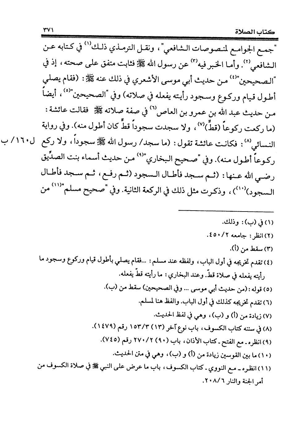 "جمع الجوامع لمنصوصات الشافعي"، ونقل الترمذي ذلك (¬1) في كتابه عن الشافعي (¬2). وأما الخبر فيه (¬3) عن رسول الله - صلى الله عليه وسلم - فثابت متفق على صحته، إذ في "الصحيحين" (¬4) من حديث أبي موسى الأشعري في ذلك عنه - صلى الله عليه وسلم -: (فقام يصلي أطول قيام وركوع وسجود رأيته يفعله في صلاته) وفي "الصحيحين" (¬5)، أيضاً من حديث عبد الله بن عمرو بن العاص (¬6) في صفة صلاته - صلى الله عليه وسلم - فقالت عائشة: (ما ركعت ركوعاً (قطٌّ) (¬7)، ولا سجدت سجوداً قطٌّ كان أطول منه). وفي رواية النسائي (¬8): فكانت عائشة تقول: (ما سجد رسول الله - صلى الله عليه وسلم - سجوداً، ولا ركع ركوعاً أطول منه). وفي "صحيح البخاري" (¬9) من حديث أسماء بنت الصدِّيق رضي الله عنها: (ثم سجد فأطال السجود (ثم رفع، ثم سجد فأطال السجود) (¬10))، وذكرت مثل ذلك في الركعة الثانية. وفي "صحيح مسلم" (¬11) من