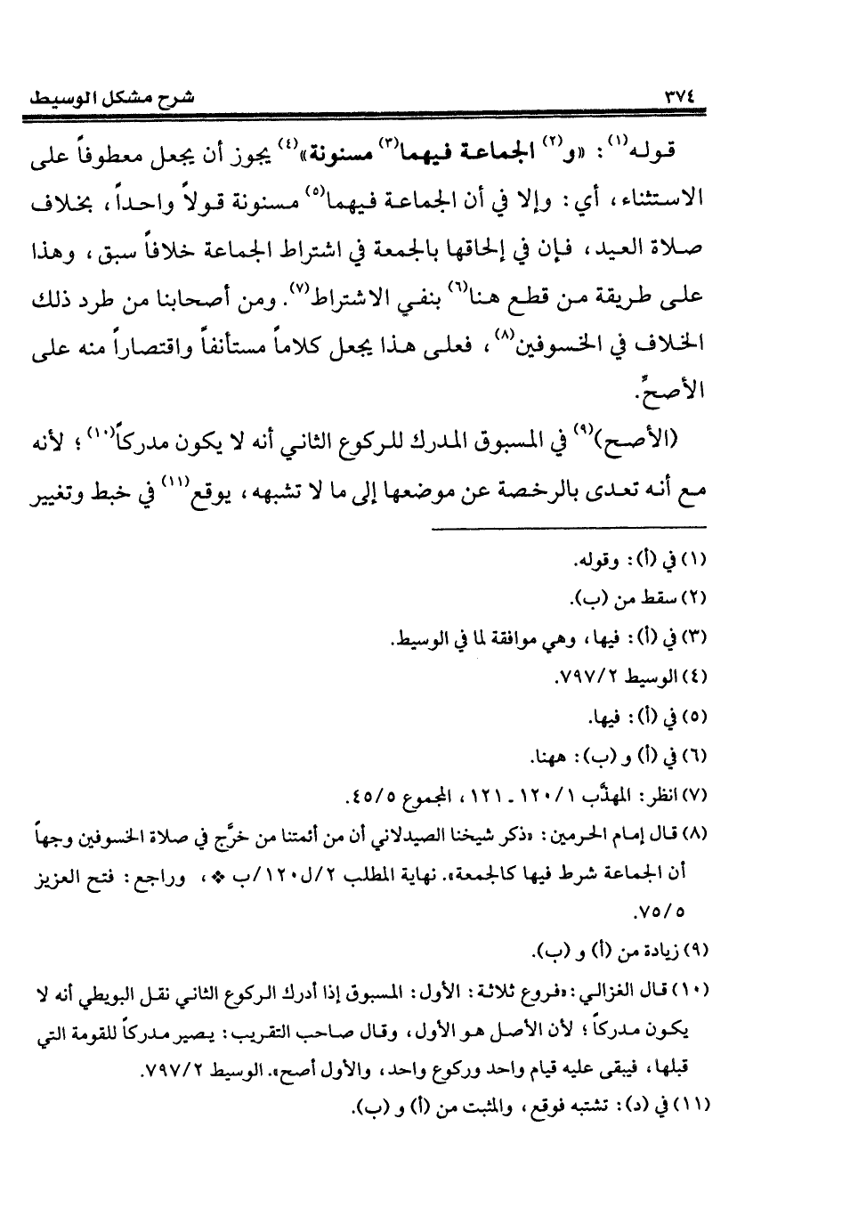 (¬8) قال إمام الحرمين: "ذكر شيخنا الصيدلاني أن من أئمتنا من خرَّج في صلاة الخسوفين وجهاً أن الجماعة شرط فيها كالجمعة". نهاية المطلب 2/ ل120/ ب، وراجع: فتح العزيز 5/ 75.