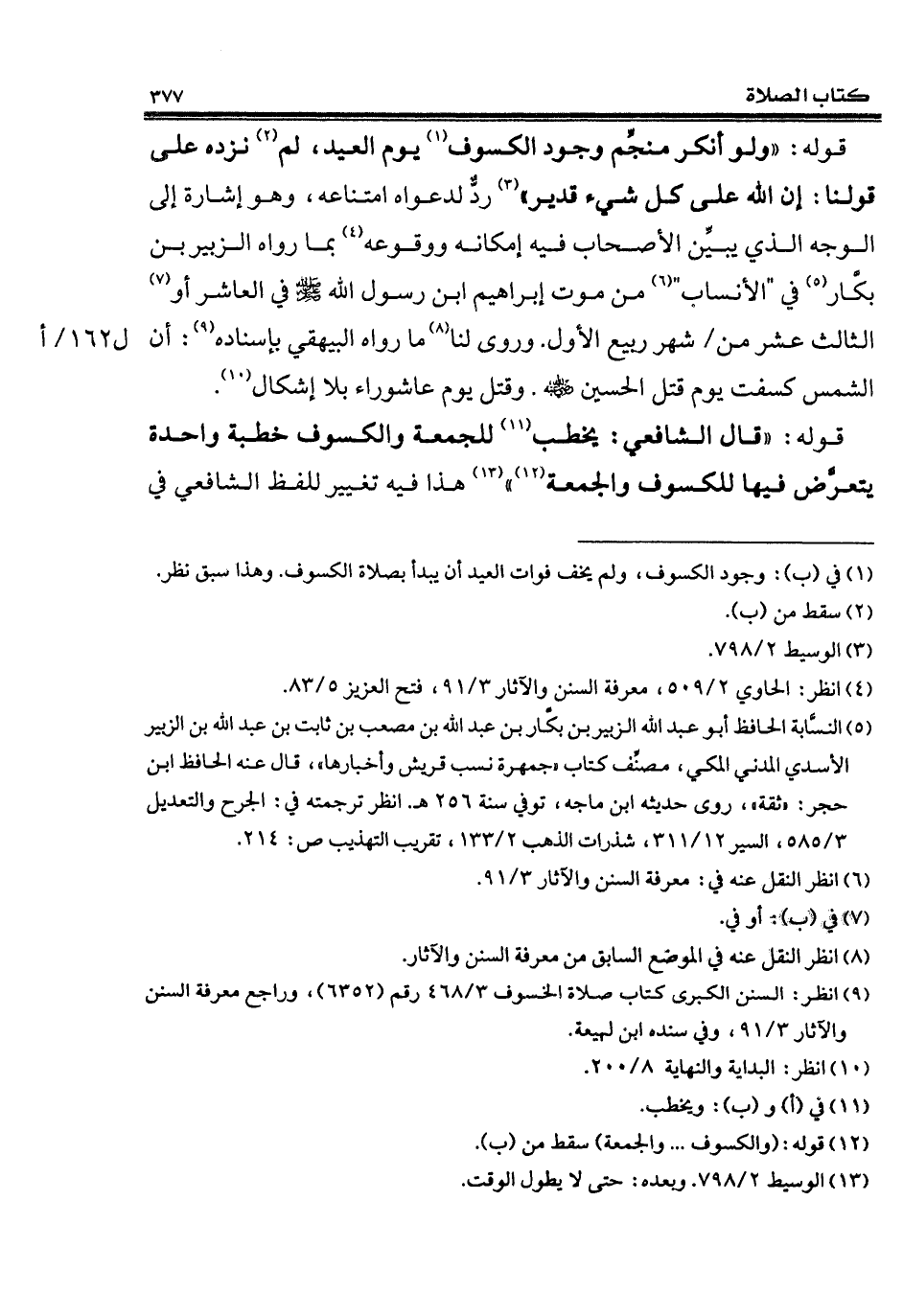 قوله: "ولو أنكر منجِّم وجود الكسوف (¬1) يوم العيد، لم (¬2) نزده على قولنا: إن الله على كل شيء قدير" (¬3) ردٌّ لدعواه امتناعه، وهو إشارة إلى الوجه الذي يبيِّن الأصحاب فيه إمكانه ووقوعه (¬4) بما رواه الزبير بن بكَّار (¬5) في "الأنساب" (¬6) من موت إبراهيم ابن رسول الله - صلى الله عليه وسلم - في العاشر أو (¬7) الثالث عشر من شهر ربيع الأول. وروى لنا (¬8) ما رواه البيهقي بإسناده (¬9): أن الشمس كسفت يوم قتل الحسين - رضي الله عنه -. وقتل يوم عاشوراء بلا إشكال (¬10).