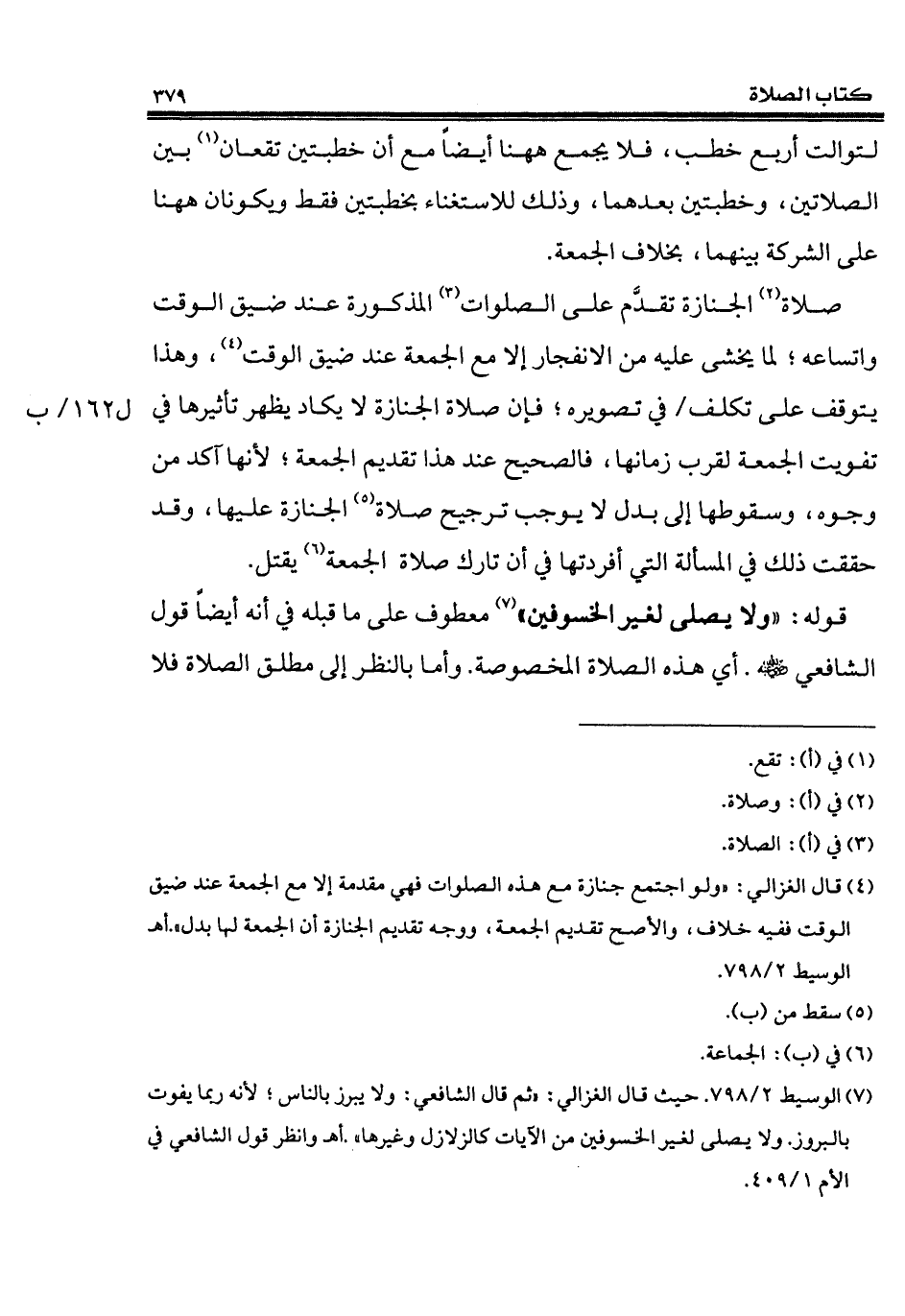 (¬4) قال الغزالي: "ولو اجتمع جنازة مع هذه الصلوات فهي مقدمة إلا مع الجمعة عند ضيق الوقت ففيه خلاف، والأصح تقديم الجمعة، ووجه تقديم الجنازة أن الجمعة لها بدل". أهـ الوسيط 2/ 798.