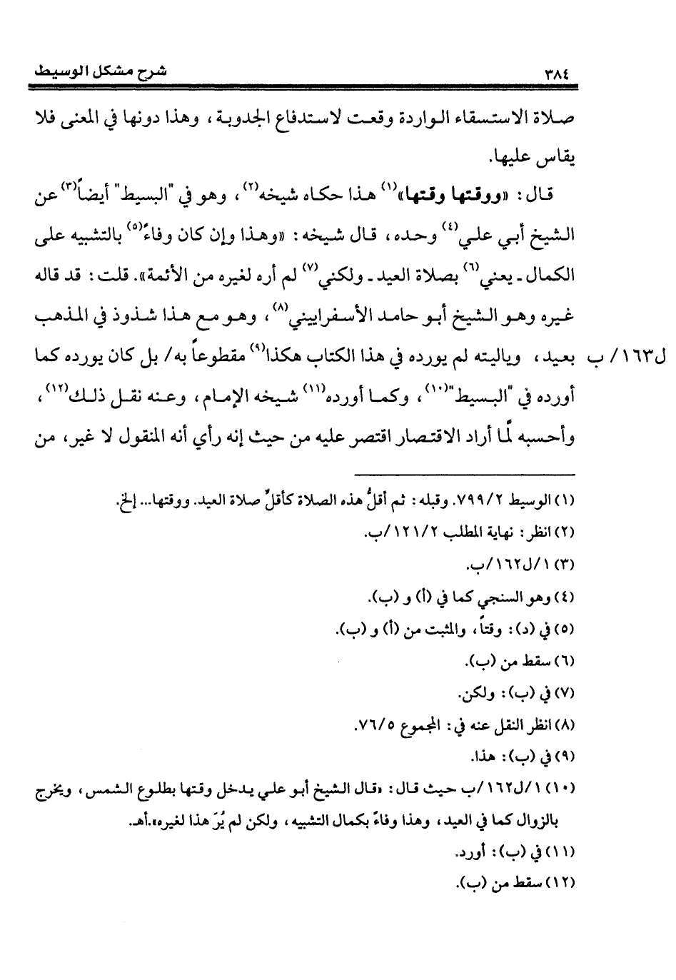 (¬1) الوسيط 2/ 799. وقبله: ثم أقلُّ هذه الصلاة كأقلِّ صلاة العيد. ووقتها ... إلخ.