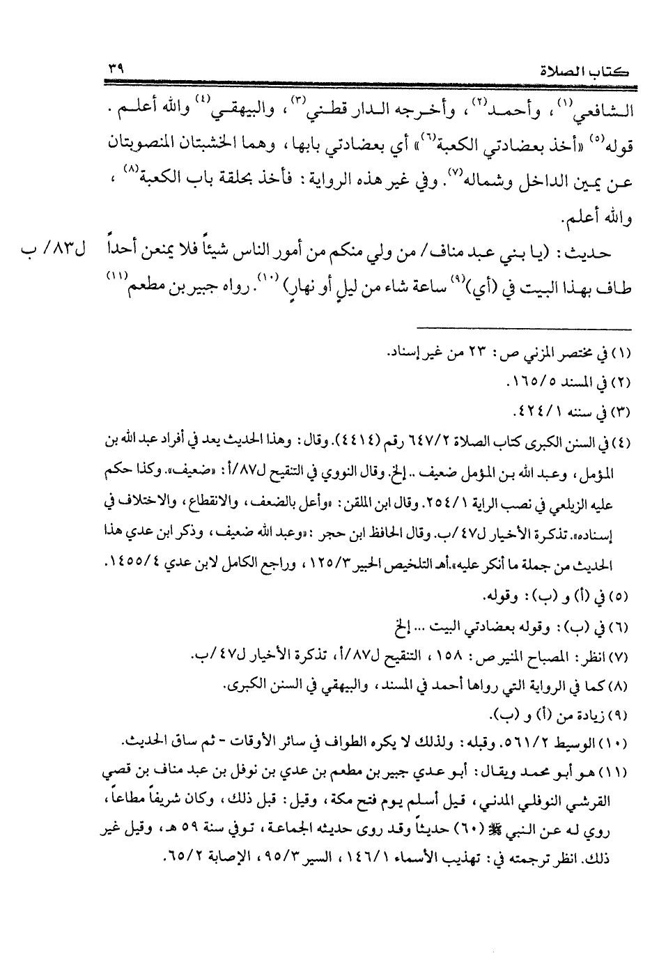حديث: (يا بني عبد مناف من ولي منكم من أمور الناس شيئاً فلا يمنعن أحداً طاف بهذا البيت في (أي) (¬9) ساعة شاء من ليلٍ أو نهارٍ) (¬10). رواه جبير بن مطعم (¬11)