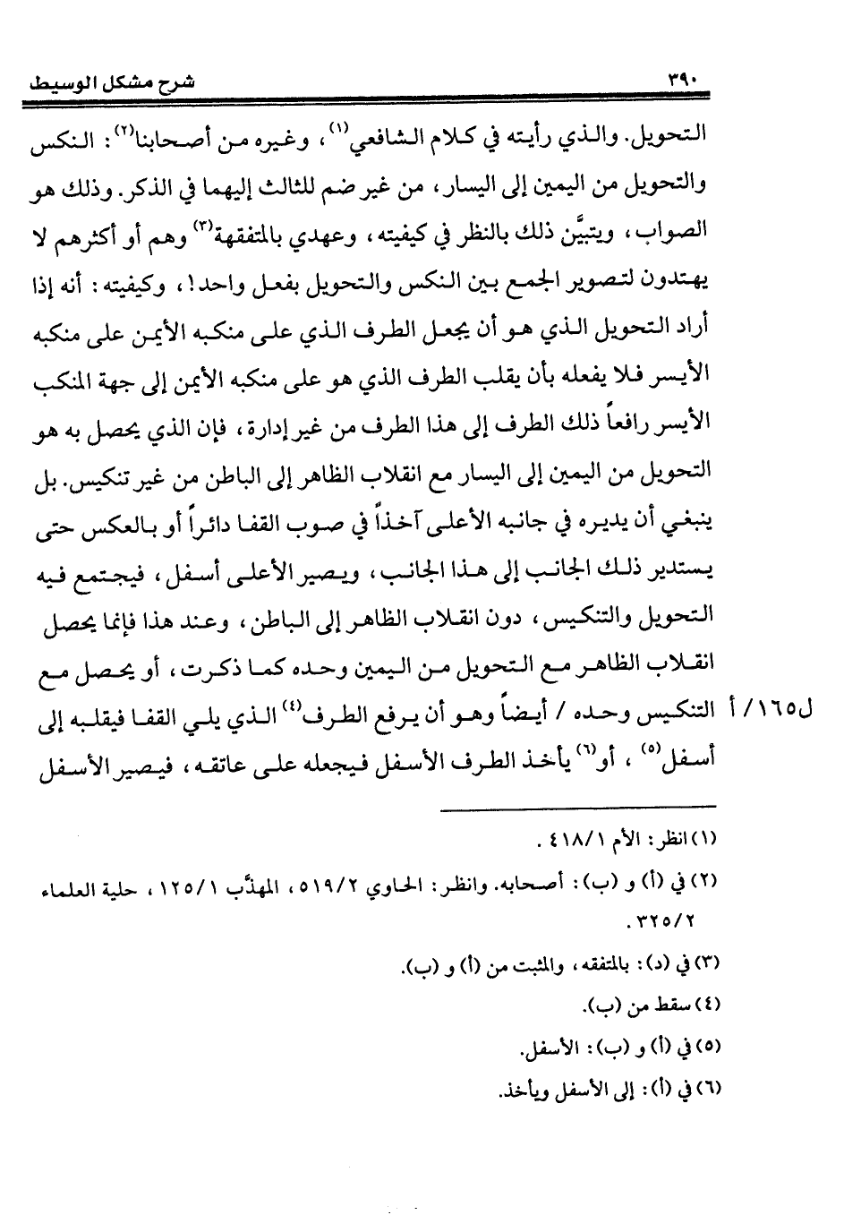 التحويل. والذي رأيته في كلام الشافعي (¬1)، وغيره من أصحابنا (¬2): النكس والتحويل من اليمين إلى اليسار، من غير ضم للثالث إليهما في الذكر. وذلك هو الصواب، ويتبيَّن ذلك بالنظر في كيفيته، وعهدي بالمتفقهة (¬3) وهم أو أكثرهم لا يهتدون لتصوير الجمع بين النكس والتحويل بفعل واحد!، وكيفيته: أنه إذا أراد التحويل الذي هو أن يجعل الطرف الذي على منكبه الأيمن على منكبه الأيسر فلا يفعله بأن يقلب الطرف الذي هو على منكبه الأيمن إلى جهة المنكب الأيسر رافعاً ذلك الطرف إلى هذا الطرف من غير إدارة، فإن الذي يحصل به هو التحويل من اليمين إلى اليسار مع انقلاب الظاهر إلى الباطن من غير تنكيس. بل ينبغي أن يديره في جانبه الأعلى آخذاً في صوب القفا دائراً أو بالعكس حتى يستدير ذلك الجانب إلى هذا الجانب، ويصير الأعلى أسفل، فيجتمع فيه التحويل والتنكيس، دون انقلاب الظاهر إلى الباطن، وعند هذا فإنما يحصل انقلاب الظاهر مع التحويل من اليمين وحده كما ذكرت، أو يحصل مع التنكيس وحده أيضاً وهو أن يرفع الطرف (¬4) الذي يلي القفا فيقلبه إلى أسفل (¬5)، أو (¬6) يأخذ الطرف الأسفل فيجعله على عاتقه، فيصير الأسفل