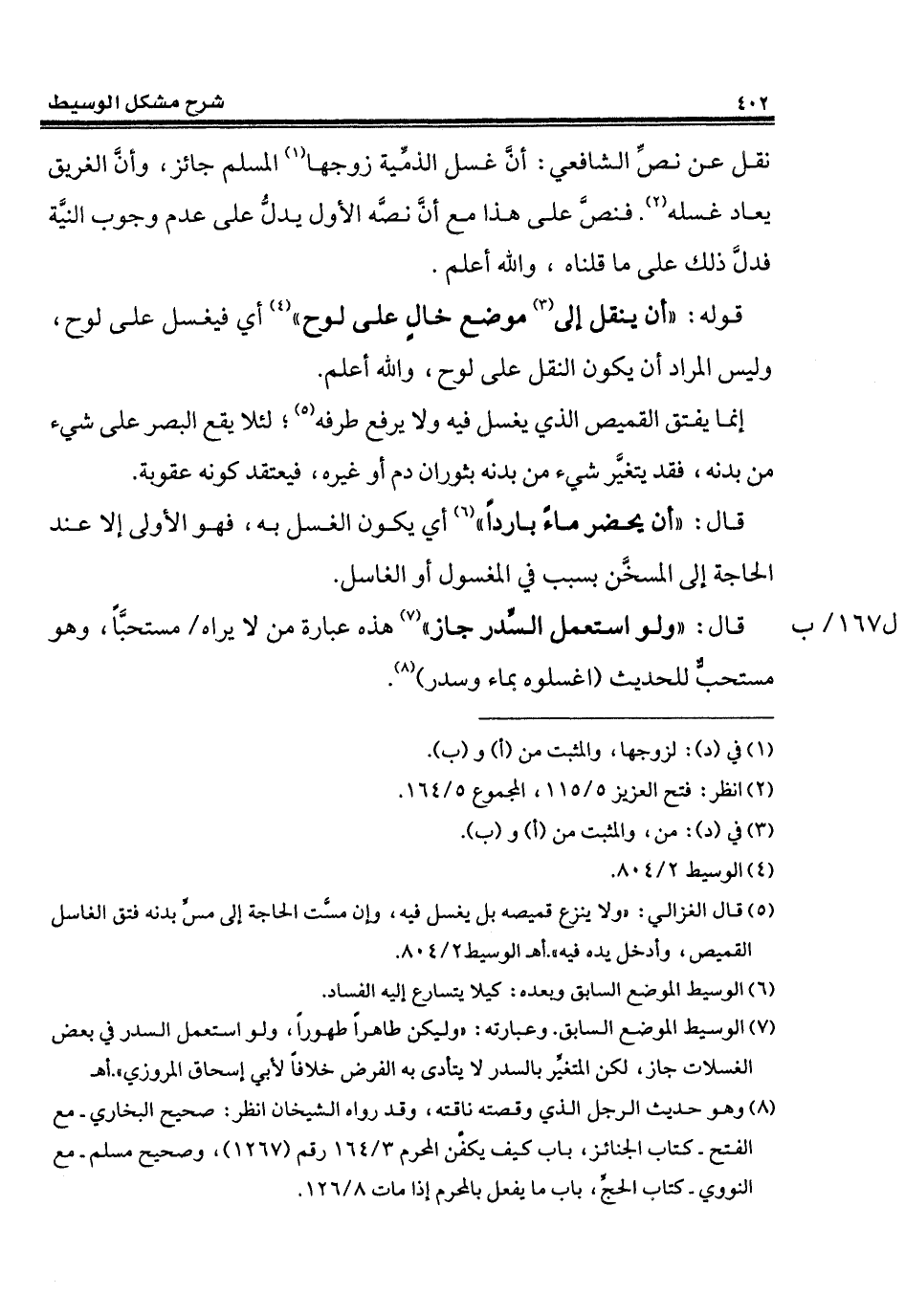 (¬5) قال الغزالي: "ولا ينزع قميصه بل يغسل فيه، وإن مسَّت الحاجة إلى مسِّ بدنه فتق الغاسل القميص، وأدخل يده فيه". أهـ الوسيط 2/ 804.
