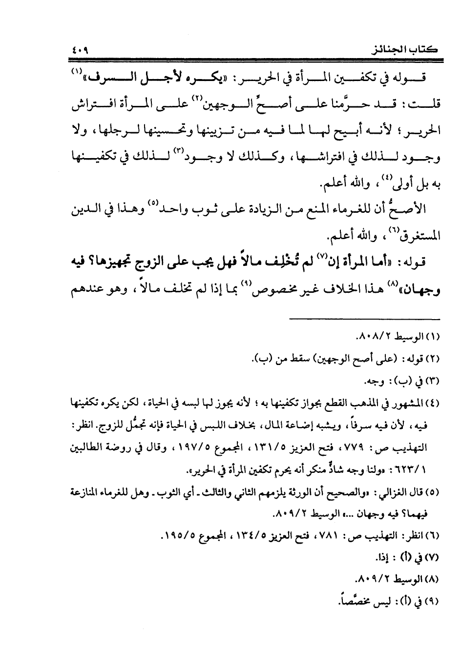 (¬4) المشهور في المذهب القطع بجواز تكفينها به؛ لأنه يجوز لها لبسه في الحياة، لكن يكره تكفينها فيه, لأن فيه سرفاً، ويشبه إضاعة المال، بخلاف اللبس في الحياة فإنه تجمُّل للزوج. انظر: التهذيب ص: 779، فتح العزيز 5/ 131، المجموع 5/ 197، وقال في روضة الطالبين 1/ 623: "ولنا وجه شاذٌّ منكر أنه يحرم تكفين المرأة في الحرير".