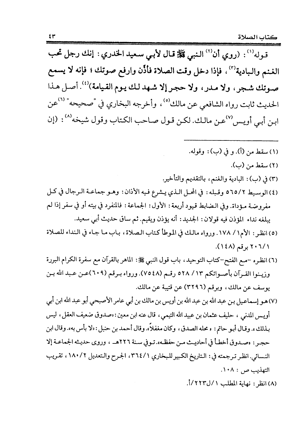 (¬5) انظر: الأم 1/ 178. ورواه مالك في الموطأ كتاب الصلاة، باب ما جاء في النداء للصلاة 1/ 206 برقم (148).