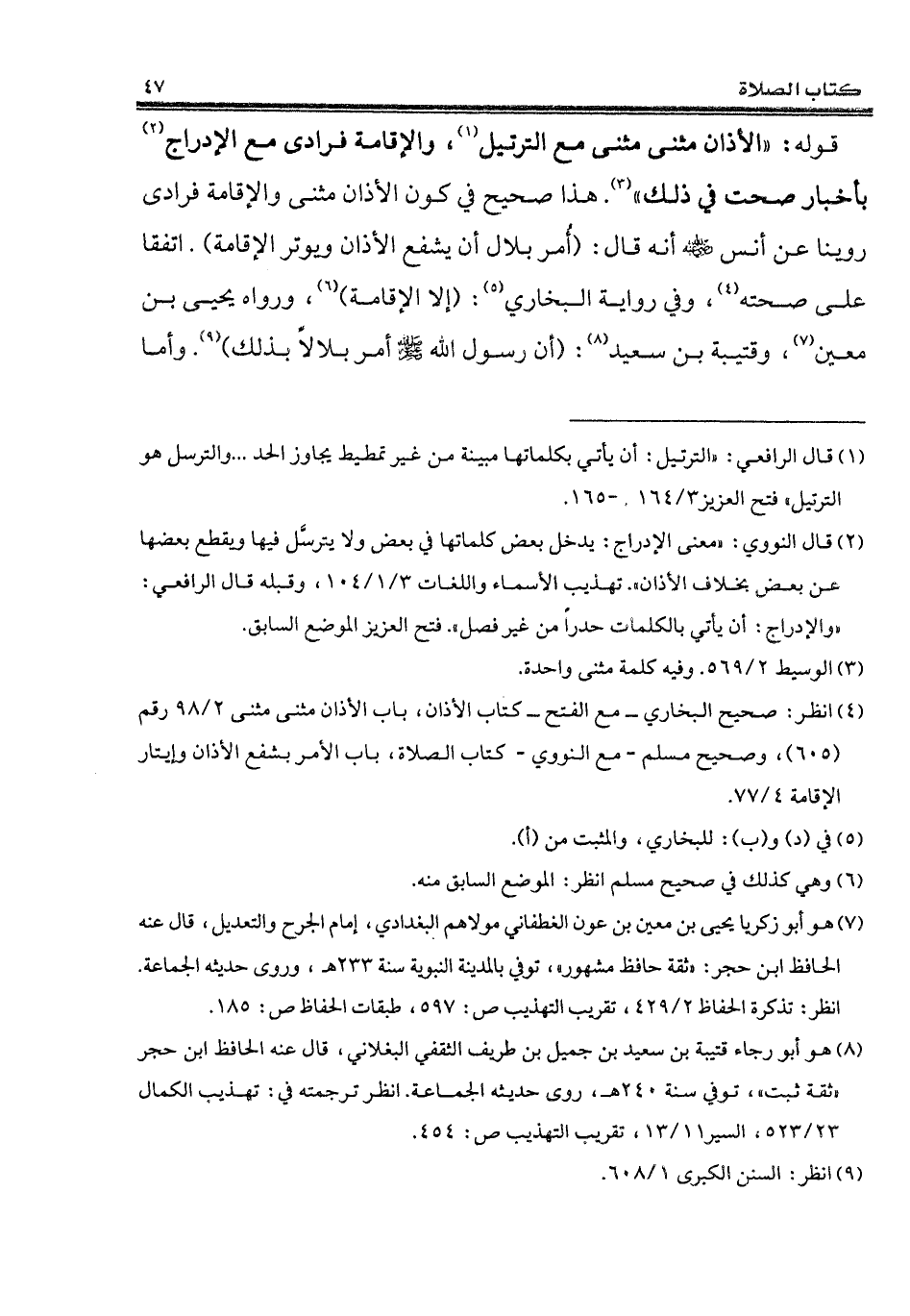 (¬4) انظر: صحيح البخاري - مع الفتح - كتاب الأذان، باب الأذان مثنى مثنى 2/ 98 رقم (605)، وصحيح مسلم - مع النووي - كتاب الصّلاة، باب الأمر بشفع الأذان وإيتار الإقامة 4/ 77.