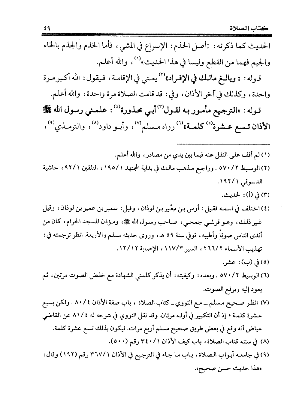 (¬7) انظر صحيح مسلم - مع النووي - كتاب الصلاة، باب صفة الأذان 4/ 80. ولكن بسبع عشرة كلمة؛ إذ أن التكبير في أوله مرتان. وقد نقل النووي في شرحه له 4/ 81 عن القاضي عياض أنه وقع في بعض طريق صحيح مسلم أربع مرات. فيكون بذلك تسع عشرة كلمة.