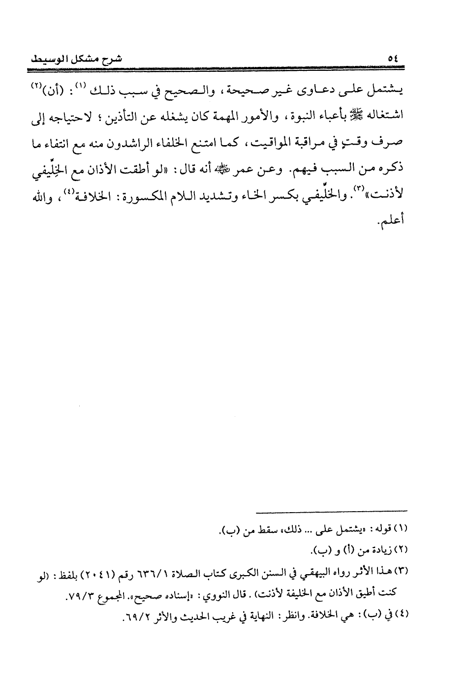 يشتمل على دعاوى غير صحيحة، والصحيح في سبب ذلك (¬1): (أن) (¬2) اشتغاله - صلى الله عليه وسلم - بأعباء النبوة، والأمور المهمة كان يشغله عن التأذين؛ لاحتياجه إلى صرف وقتٍ في مراقبة المواقيت، كما امتنع الخلفاء الراشدون منه مع انتفاء ما ذكره من السبب فيهم. وعن عمر - رضي الله عنه - أنه قال: "لو أطقت الأذان مع الخِلِّيفي لأذنت" (¬3). والخلِّيفي بكسر الخاء وتشديد اللام المكسورة: الخلافة (¬4)، والله أعلم.