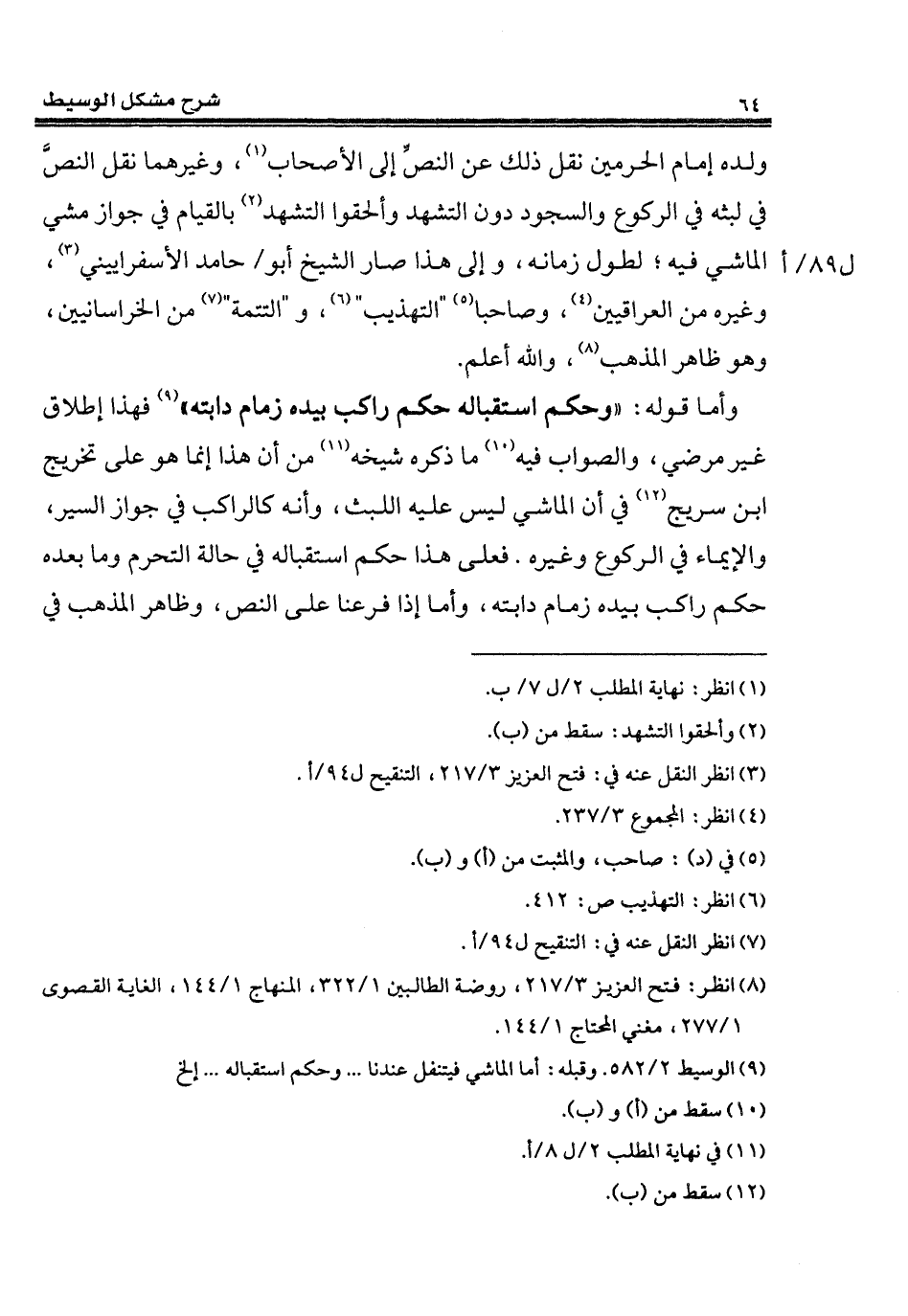 (¬9) الوسيط 2/ 582. وقبله: أمّا الماشي فيتنفل عندنا ... وحكم استقباله ... إلخ
