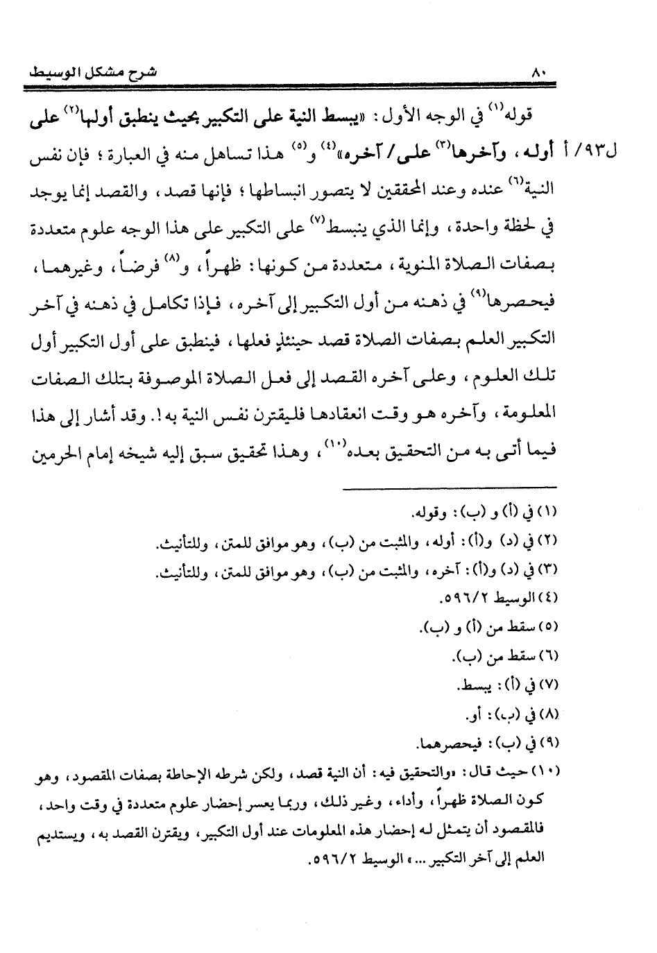 (¬10) حيث قال: "والتحقيق فيه: أن النية قصد، ولكن شرطه الإحاطة بصفات المقصود، وهو كون الصلاة ظهراً، وأداء، وغير ذلك، وربما يعسر إحضار علوم متعددة في وقت واحد، فالمقصود أن يتمثل له إحضار هذه المعلومات عند أول التكبير، ويقترن القصد به، ويستديم العلم إلى آخر التكبير ... " الوسيط 2/ 596.