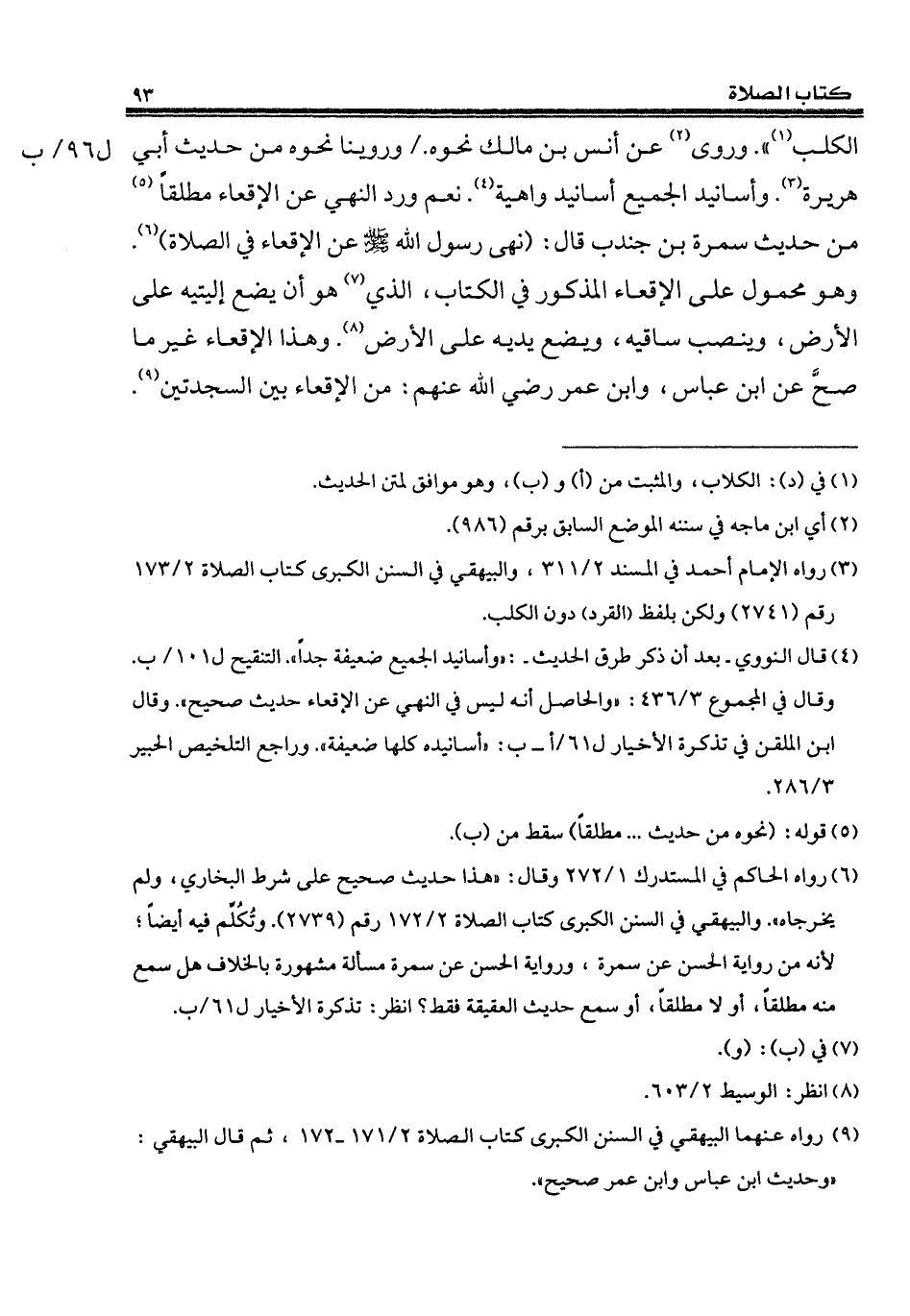 (¬4) قال النووي - بعد أن ذكر طرق الحديث -: "وأسانيد الجميع ضعيفة جداً". التنقيح ل 101/ ب. وقال في المجموع 3/ 436: "والحاصل أنّه ليس في النهي عن الإقعاء حديث صحيح". وقال ابن الملقن في تذكرة الأخيار ل 61/ أ - ب: "أسانيده كلها ضعيفة". وراجع التلخيص الحبير 3/ 286.
