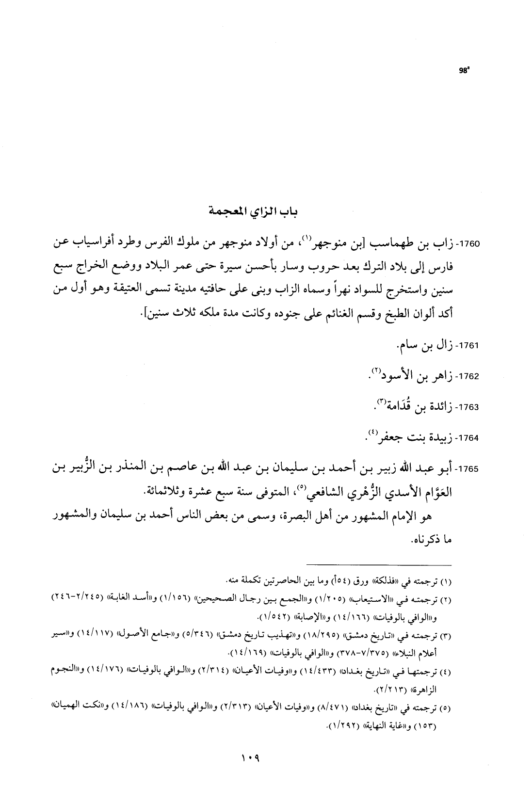1765 - أبو عبد الله زبير بن أحمد بن سليمان بن عبد الله بن عاصم بن المنذر بن الزُّبير بن العَوّام الأسدي الزُهْري الشافعي (¬5)، المتوفى سنة سبع عشرة وثلاثمائة.