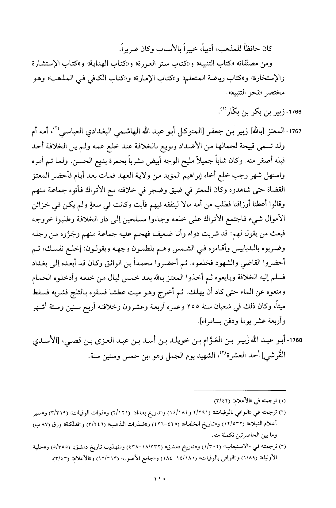 1768 - أبو عبد الله زُبير بن العَوَّام بن خويلد بن أسد بن عبد العزى بن قصي، [الأسدي القُرشي] أحد العشرة (¬3)، الشهيد يوم الجمل وهو ابن خمس وستين سنة.
