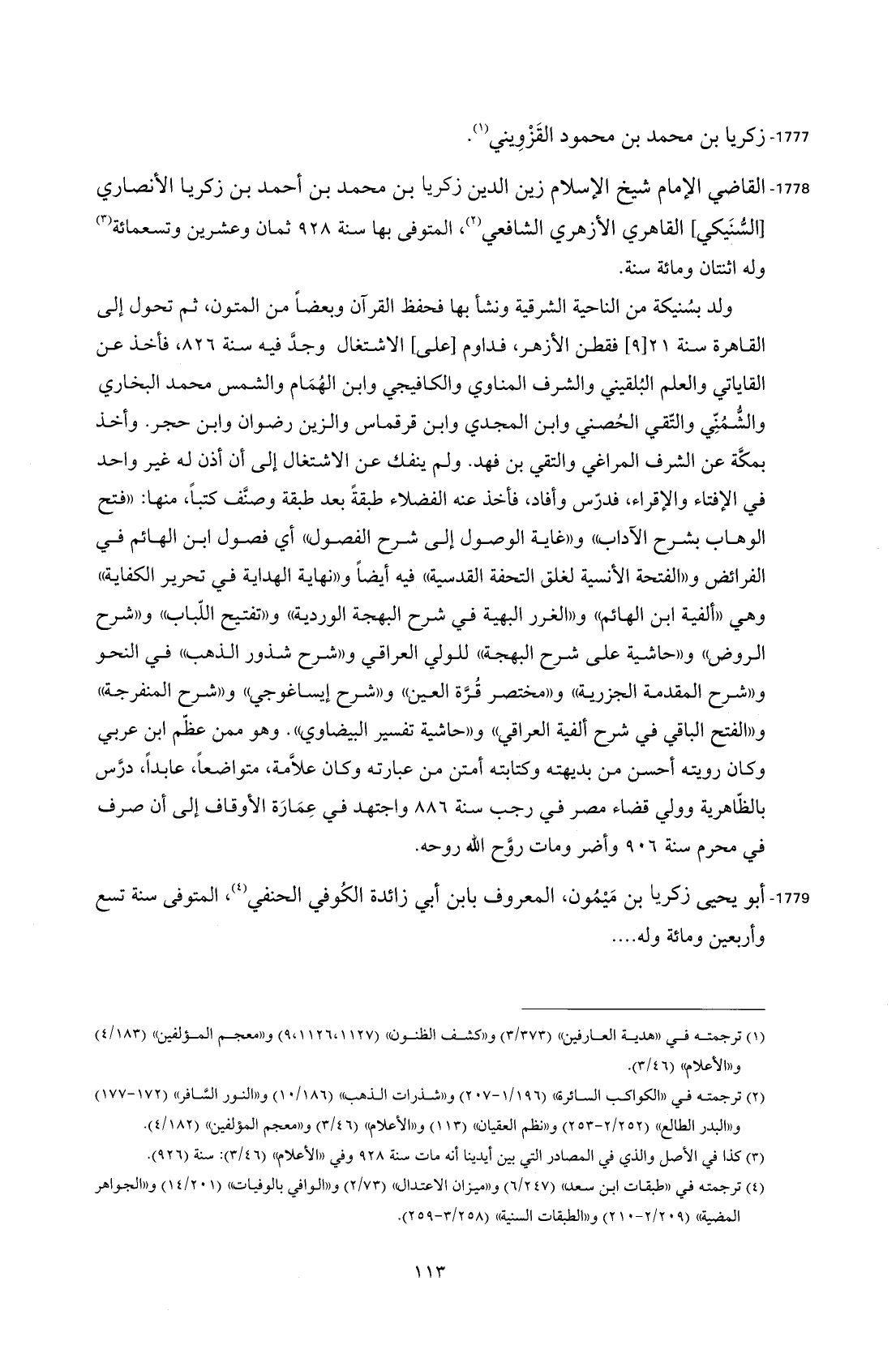 1778 - القاضي الإمام شيخ الإسلام زين الدين زكريا بن محمد بن أحمد بن زكريا الأنصاري [السُّنَيكي] القاهري الأزهري الشافعي (¬2)، المتوفى بها سنة 928 ثمان وعشرين وتسعمائة (¬3) وله اثنتان ومائة سنة.