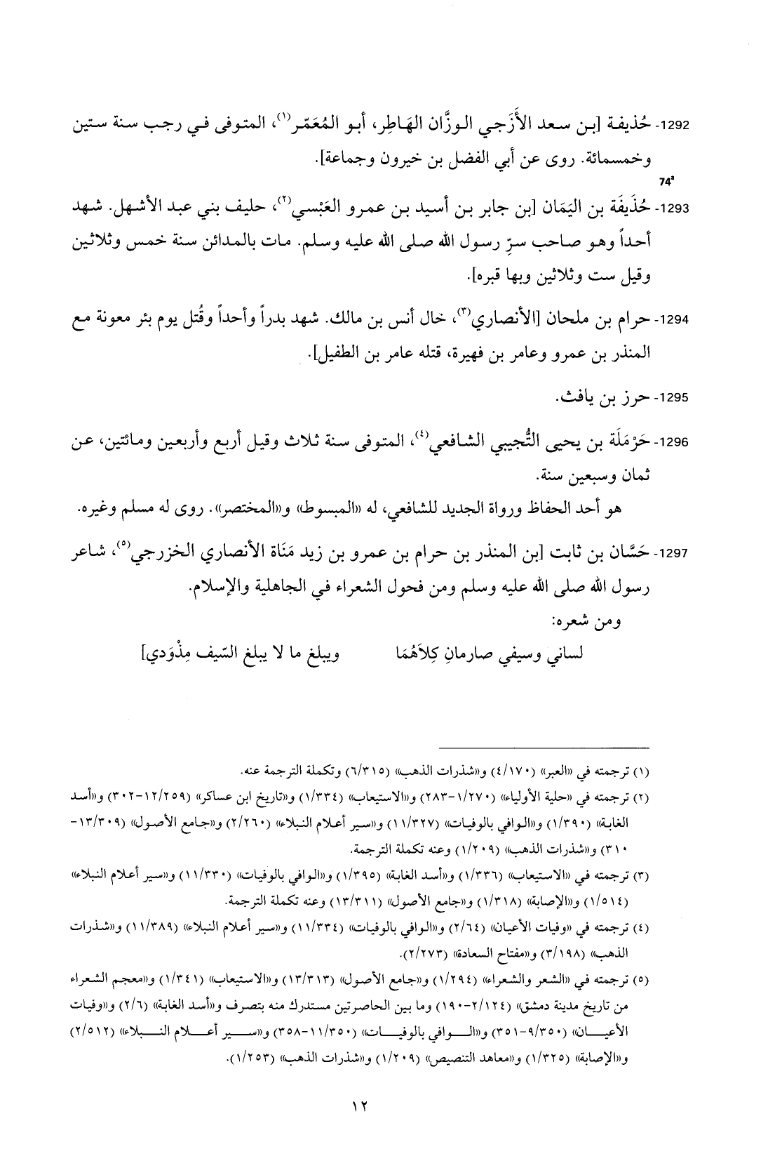 1297 - حَسَّان بن ثابت [بن المنذر بن حرام بن عمرو بن زيد مَنَاة الأنصاري الخزرجي (¬5)، شاعر رسول الله - صلى الله عليه وسلم - ومن فحول الشعراء في الجاهلية والإسلام.