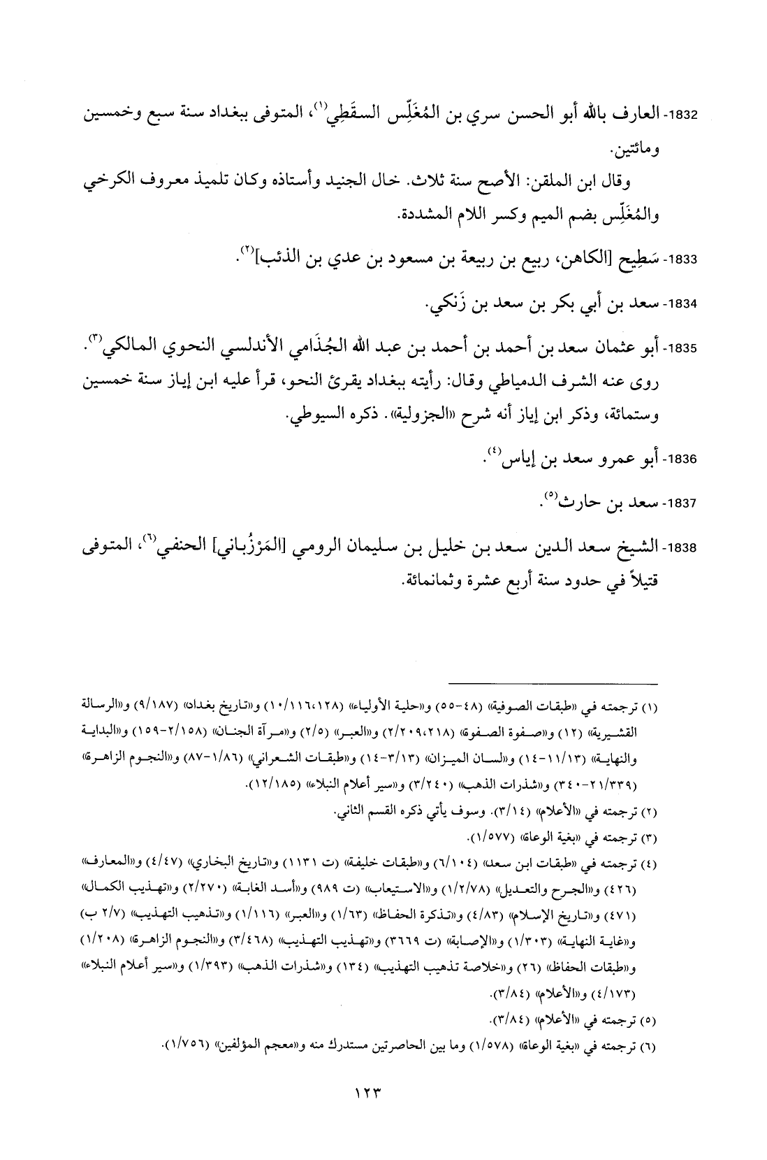 1832 - العارف بالله أبو الحسن سري بن المُغَلِّس السقَطِي (¬1)، المتوفى ببغداد سنة سبع وخمسين ومائتين.