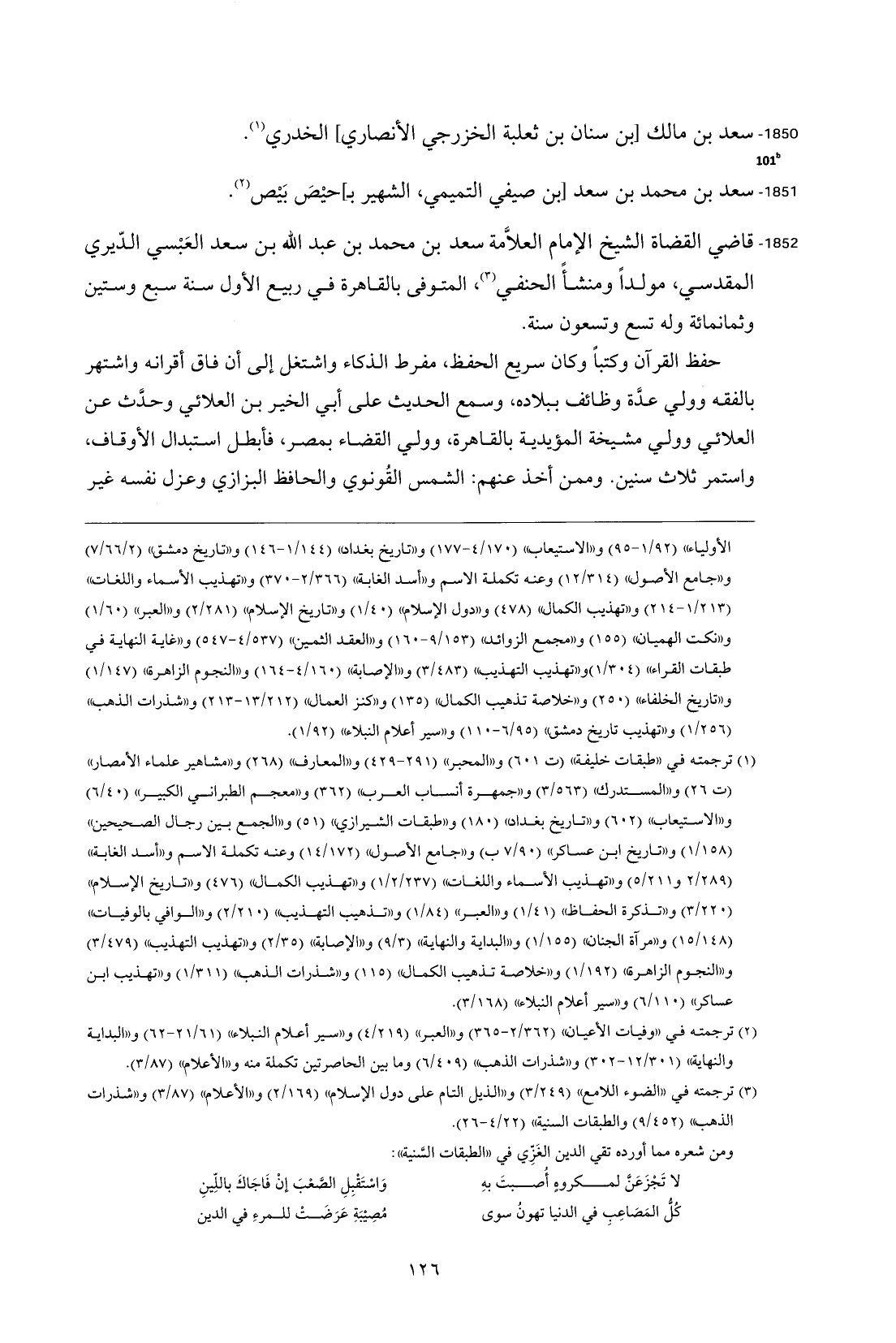 1852 - قاضي القضاة الشيخ الإمام العلَّامة سعد بن محمد بن عبد الله بن سعد العَبْسي الدّيري المقدسي، مولدًا ومنشأً الحنفي (¬3)، المتوفى بالقاهرة في ربيع الأول سنة سبع وستين وثمانمائة وله تسع وتسعون سنة.