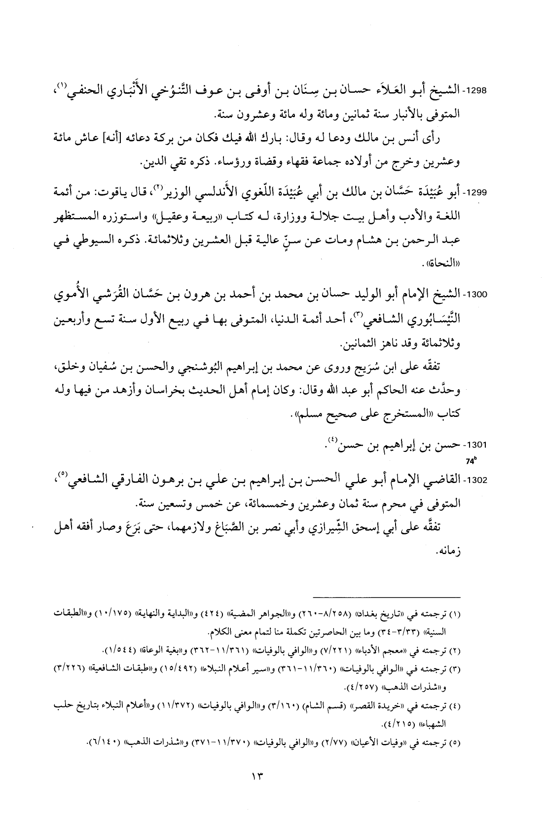 1300 - الشيخ الإمام أبو الوليد حسان بن محمد بن أحمد بن هرون بن حَسَّان القُرَشي الأُموي النَّيْسَابُوري الشافعي (¬3)، أحد أئمة الدنيا، المتوفى بها في ربيع الأول سنة تسع وأربعين وثلاثمائة وقد ناهز الثمانين.