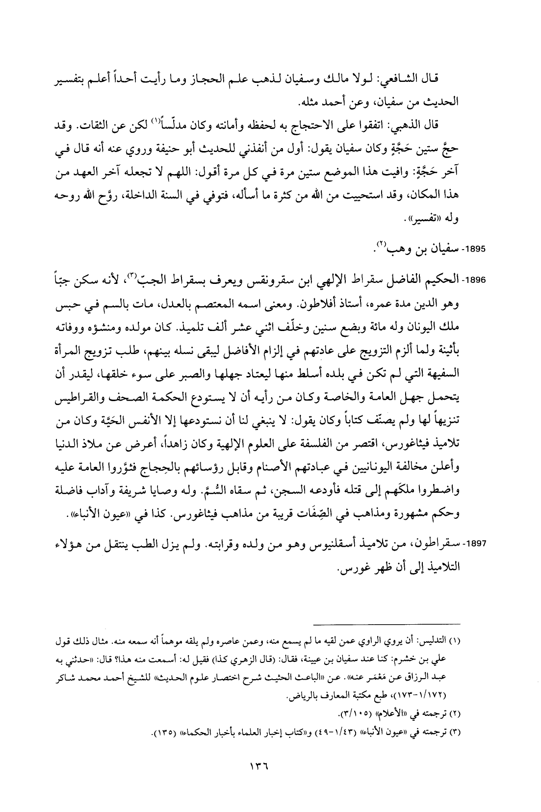 1896 - الحكيم الفاضل سقراط الإلهي ابن سقرونقس ويعرف بسقراط الجبّ (¬3)، لأنه سكن جبًّا وهو الدين مدة عمره، أستاذ أفلاطون. ومعنى اسمه المعتصم بالعدل، مات بالسم في حبس ملك اليونان وله مائة وبضع سنين وخلّف اثني عشر ألف تلميذ. كان مولده ومنشؤه ووفاته بأثينة ولما ألزم التزويج على عادتهم في إلزام الأفاضل ليبقى نسله بينهم، طلب تزويج المرأة السفيهة التي لم تكن في بلده أسلط منها ليعتاد جهلها والصبر على سوء خلقها، ليقدر أن يتحمل جهل العامة والخاصة وكان من رأيه أن لا يستودع الحكمة الصحف والقراطيس تنزيهًا لها ولم يصنّف كتابًا وكان يقول: لا ينبغي لنا أن نستودعها إلا الأنفس الحَيَّة وكان من تلاميذ فيثاغورس، اقتصر من الفلسفة على العلوم الإلهية وكان زاهدًا، أعرض عن ملاذ الدنيا وأعلن مخالفة اليونانيين في عبادتهم الأصنام وقابل رؤسائهم بالحِجاج فثوَّروا العامة عليه واضطروا ملكَهم إلى قتله فأودعه السجن، ثم سقاه السُّمَّ. وله وصايا شريفة وآداب فاضلة وحكم مشهورة ومذاهب في الصِّفات قريبة من مذاهب فيثاغورس. كذا في "عيون الأنباء".