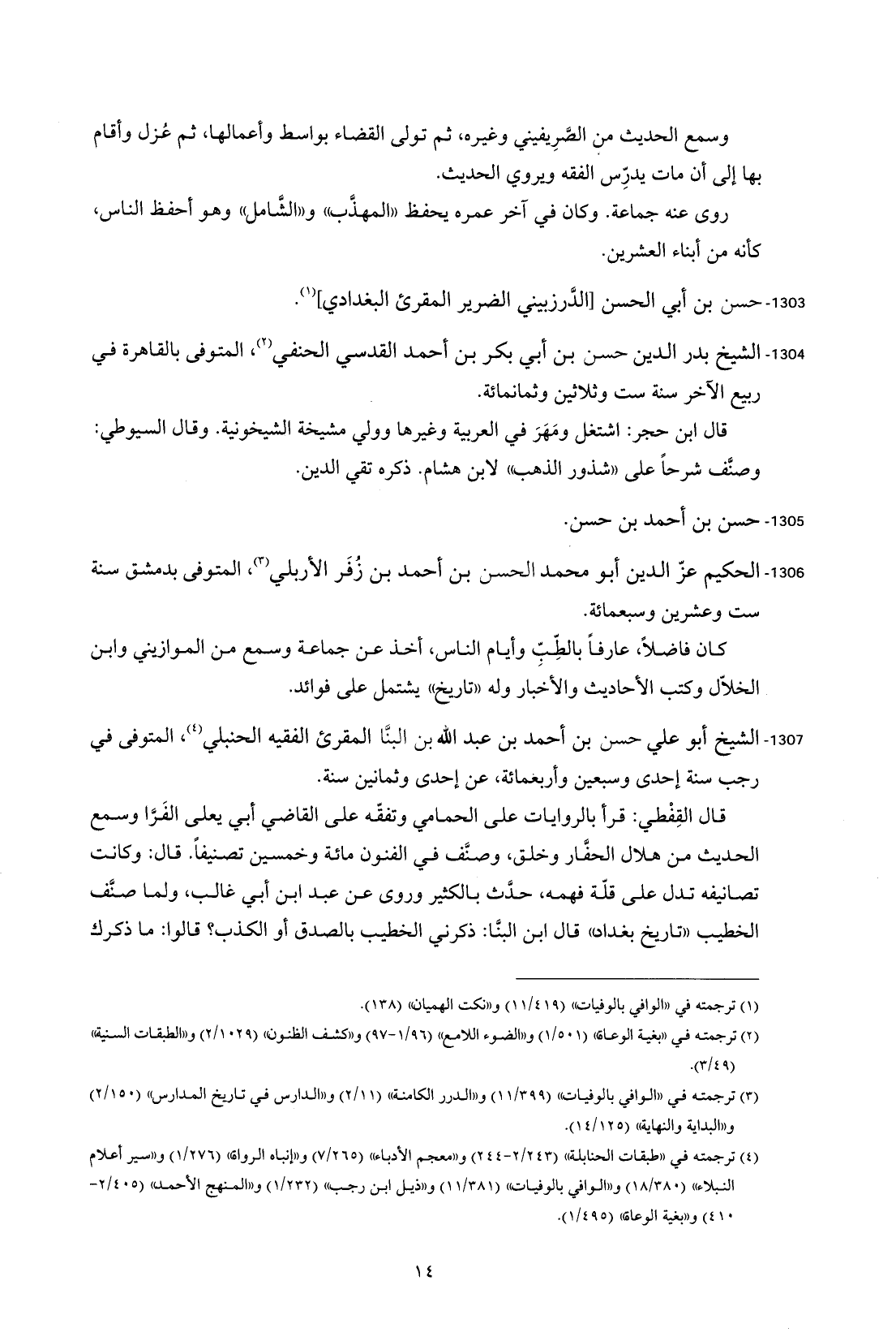 1306 - الحكيم عزّ الدين أبو محمد الحسن بن أحمد بن زُفَر الأربلي (¬3)، المتوفى بدمشق سنة ست وعشرين وسبعمائة.