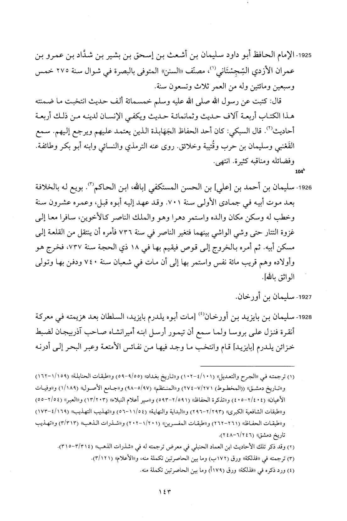 1925 - الإمام الحافظ أبو داود سليمان بن أشعث بن إسحاق بن بشير بن شدّاد بن عمرو بن عمران الأزدي السِّجِسْتاني (¬1)، مصنّف "السنن" المتوفى بالبصرة في شوال سنة 275 خمس وسبعين ومائتين وله من العمر ثلاث وتسعون سنة.