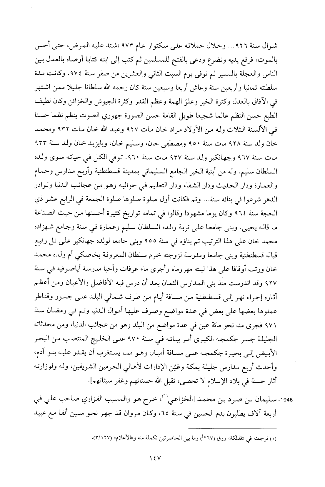 شوال سنة 926 ... وخلال حملاته على سكتوار عام 973 اشتد عليه المرض، حتى أحس بالموت، فرفع يديه وتضرع ودعى بالفتح للمسلمين ثم كتب إلى ابنه كتابا أوصاه بالعدل بين الناس والعجلة بالمسير ثم توفي يوم السبت الثاني والعشرين من صفر سنة 974. وكانت مدة سلطنته ثمانيا وأربعين سنة وعاش أربعًا وسبعين سنة كان -رحمه الله- سلطانا جليلا ممن اشتهر في الآفاق بالعدل وكثرة الخير وعلوّ الهمة وعظم القدر وكثرة الجيوش والخزائن وكان لطيف الطبع حسن النظم عالما شجيعا طويل القامة حسن الصورة جهوري الصوت ينظم نظما حسنا في الألسنة الثلاث وله من الأولاد مراد خان مات 927 وعبد الله خان مات 932 ومحمد خان ولد سنة 928 مات سنة 950 ومصطفى خان، وسليم خان، وبايزيد خان ولد سنة 933 مات سنة 967 وجهانكير ولد سنة 937 مات سنة 960. توفي الكل في حياته سوى ولده السلطان سليم. وله من أبنية الخير الجامع السليماني بمدينة قسطنطنية وأربع مدارس وحمام والعمارة ودار الحديث ودار الشفاء ودار التعليم في حواليه وهو من عجائب الدنيا ونوادر الدهر شرعوا في بنائه سنة ... وتم فكانت أول صلوة صلوها صلوة الجمعة في الرابع عشر ذي الحجة سنة 964 وكان يوما مشهودا وقالوا في تمامه تواريخ كثيرة أحسنها من حيث الصناعة ما قاله يحيى. وبنى جامعا على تربة والده السلطان سليم وعمارة في سنة وجامع شهزاده محمد خان على هذا الترتيب تم بناؤه في سنة 955 وبنى جامعا لولده جهانكير على تل رفيع قبالة قسطنطنية وبنى جامعا ومدرسة لزوجته خرم سلطان المعروفة بخاصكي أم ولده محمد خان ورتب أوقافا على هذا لبنته مهروماه وأجرى ماء عرفات وأحيا مدرسة أياصوفيه في سنة 927 وقد اندرست منذ بني المدارس الثمان بعد أن درس فيه الأفاضل والأعيان ومن أعظم أثاره إجراء نهر إلى قسطنطنية من مسافة أيام من طرف شمالي البلد على جسور وقناطر عملوها بعضها على بعض في عدة مواضع وصرف عليها أموال الدنيا وتم في رمضان سنة 971 فجرى منه نحو مائة عين في عدة مواضع من البلد وهو من عجائب الدنيا، ومن محدثاته الجليلة جسر جكمجه الكبرى أمر ببنائه في سنة 970 على الخليج المنتصب من البحر الأبيض إلى بحيرة جكمجه على مسافة أميال وهو مما يستغرب أن يقدر عليه بنو آدم، وأحدث أربع مدارس جليلة بمكة وعَيَّن الإدارات لأهالي الحرمين الشريفين، وله ولوزارئه أثار حسنة في بلاد الإسلام لا تحصى، تقبل الله حسناتهم وغفر سيئاتهم].