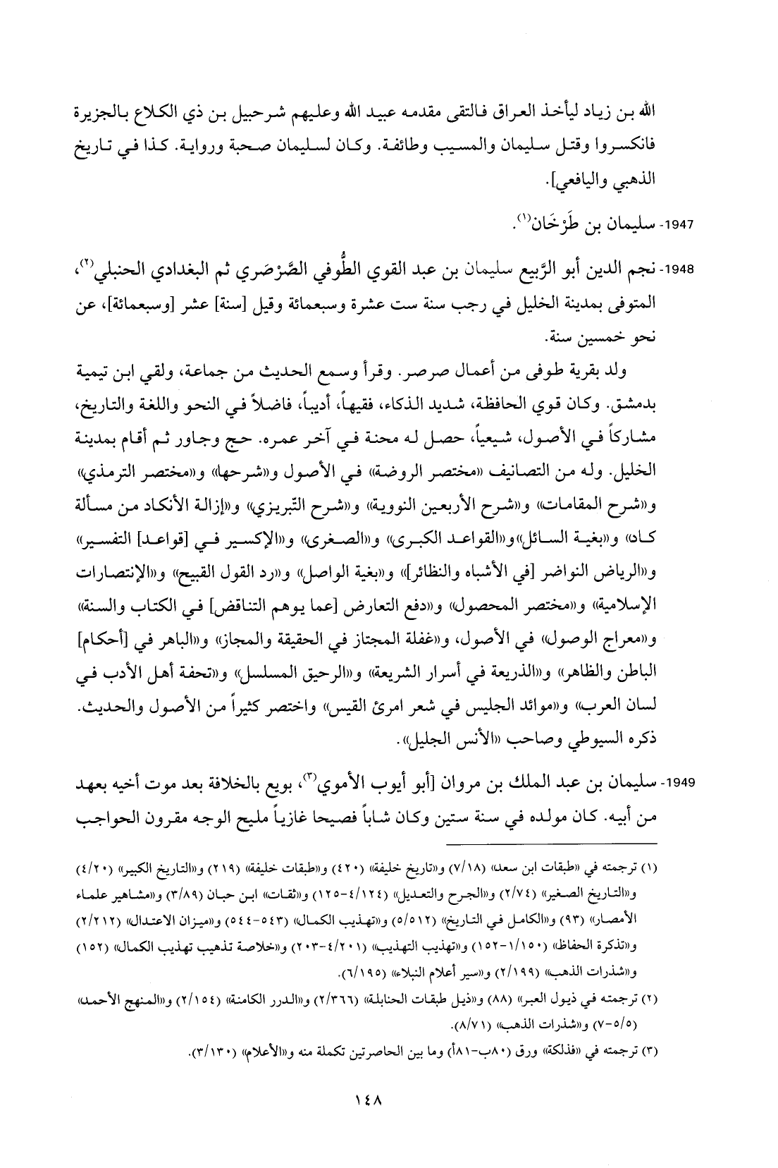 1948 - نجم الدين أبو الرَّبيع سليمان بن عبد القوي الطُّوفي الصَّرْصَري ثم البغدادي الحنبلي (¬2)، المتوفى بمدينة الخليل في رجب سنة ست عشرة وسبعمائة وقيل [سنة] عشر [وسبعمائة]، عن نحو خمسين سنة.