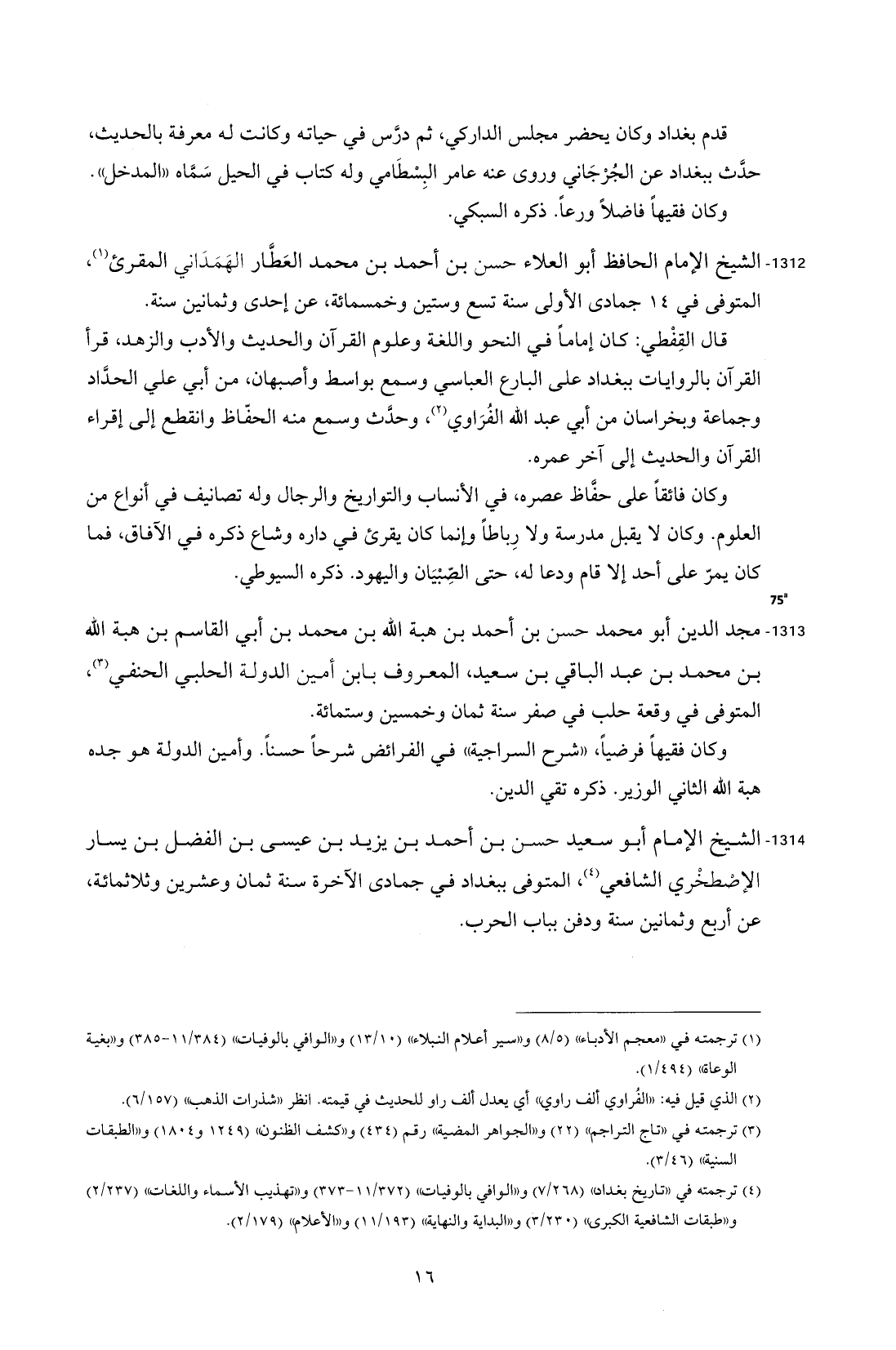 1312 - الشيخ الإمام الحافظ أبو العلاء حسن بن أحمد بن محمد العَطُّار الهمَداني المقرئ (¬1)، المتوفى في 14 جمادى الأولى سنة تسع وستين وخمسمائة، عن إحدى وثمانين سنة.