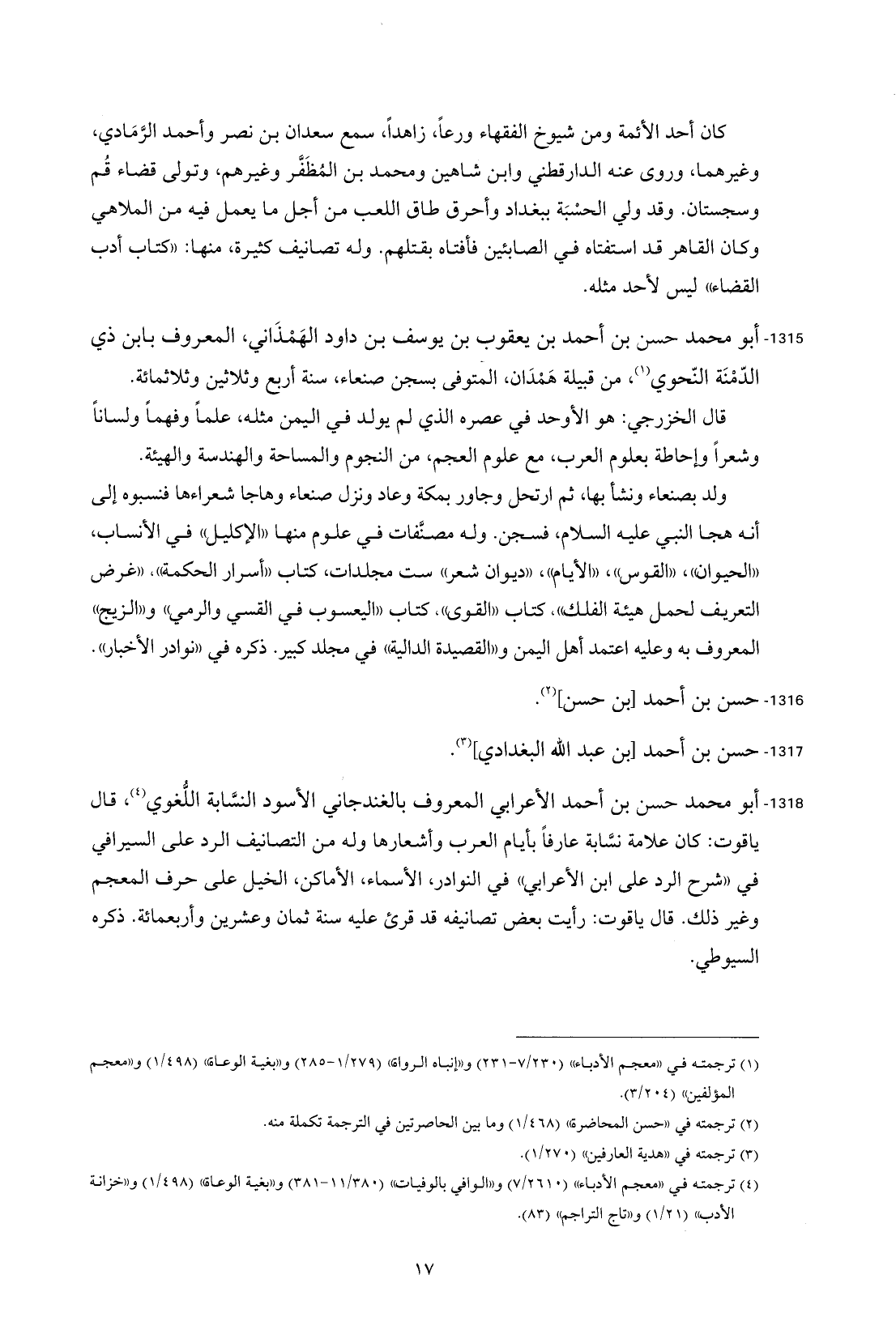 1315 - أبو محمد حسن بن أحمد بن يعقوب بن يوسف بن داود الهمذَاني، المعروف بابن ذي الدّمنَة النّحوي (¬1)، من قبيلة هَمْدَان، المتوفى بسجن صنعاء، سنة أربع وثلاثين وثلاثمائة.
