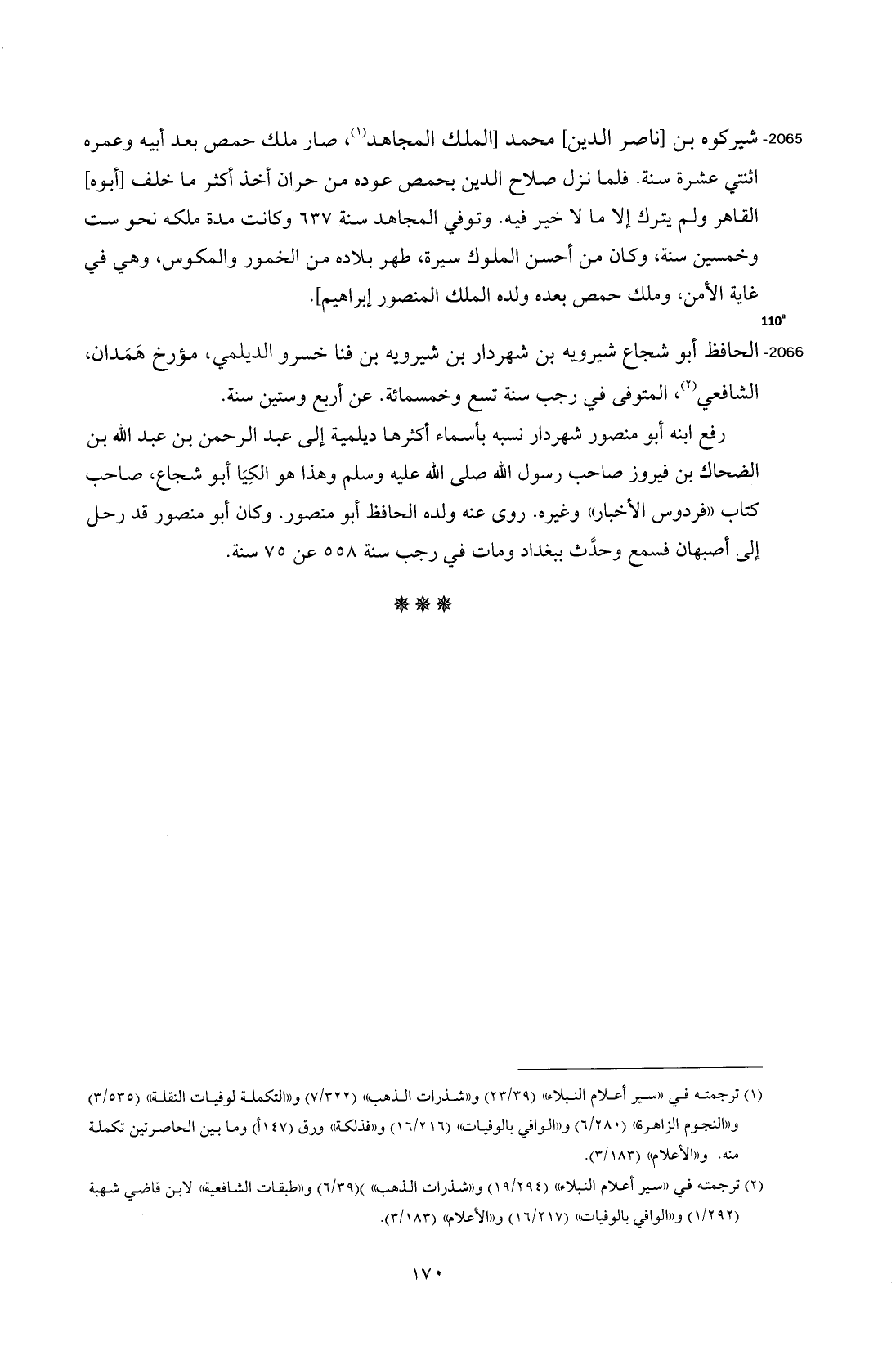2066 - الحافظ أبو شجاع شيرويه بن شهر دار بن شيرويه بن فنا خسرو الديلمي، مؤرخ هَمَدان، الشافعي (¬2)، المتوفى في رجب سنة تسع وخمسمائة. عن أربع وستين سنة.