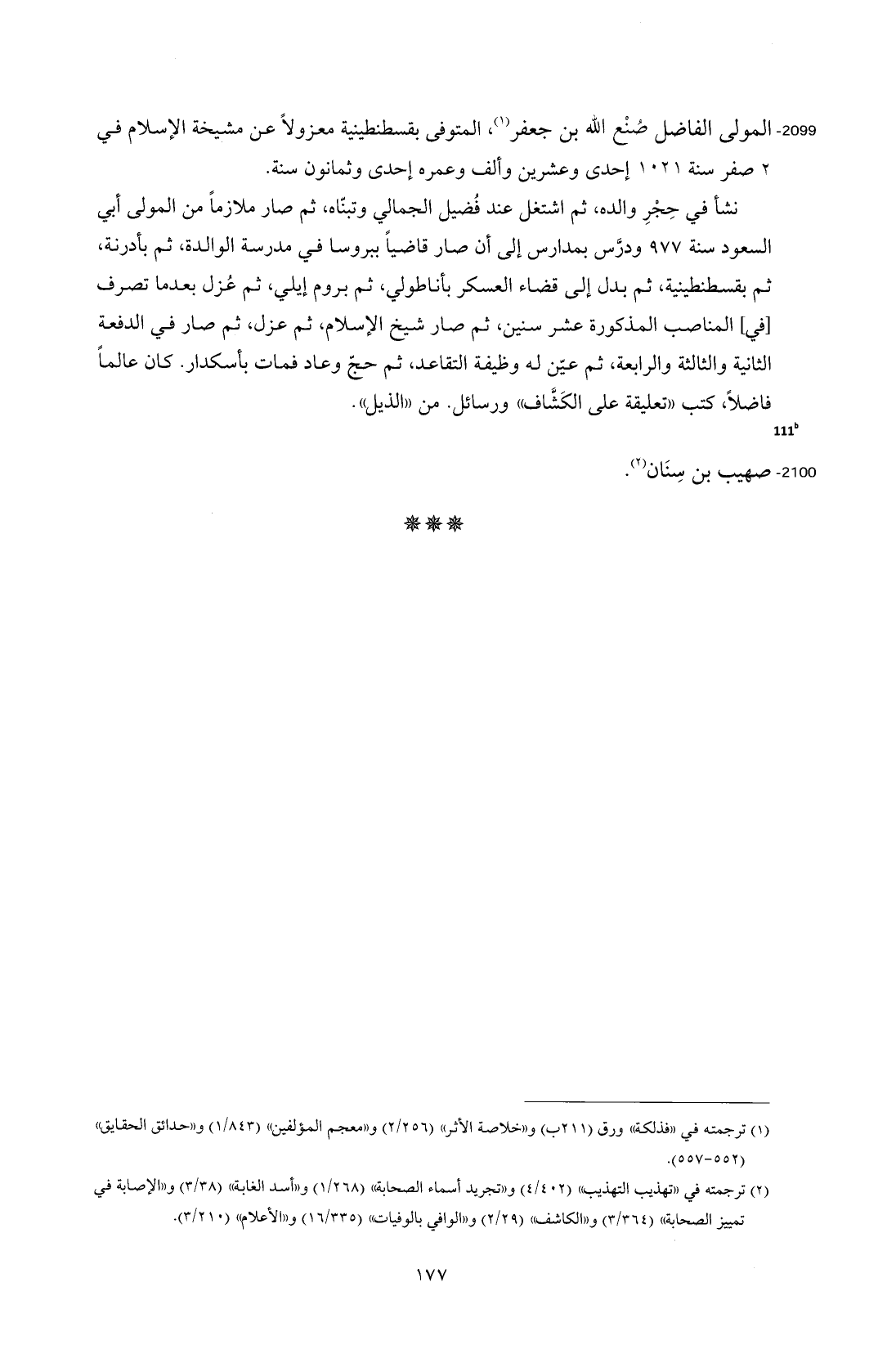 2099 - المولى الفاضل صُنْع الله بن جعفر (¬1)، المتوفى بقسطنطينية معزولاً عن مشيخة الإسلام في 2 صفر سنة 1021 إحدى وعشرين وألف وعمره إحدى وثمانون سنة.