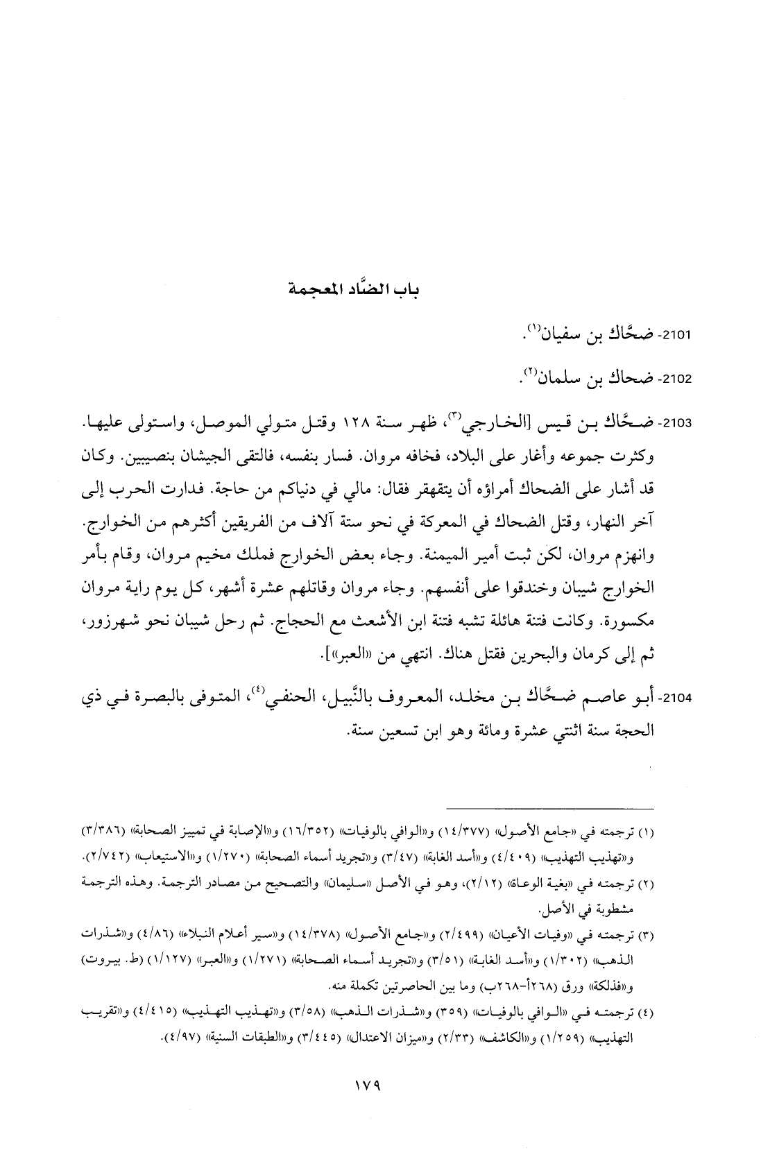 2103 - ضحَّاك بن قيس [الخارجي (¬3)، ظهر سنة 128 وقتل متولي الموصل، واستولى عليها. وكثرت جموعه وأغار على البلاد، فخافه مروان. فسار بنفسه، فالتقى الجيشان بنصيبين. وكان قد أشار على الضحاك أمراؤه أن يتقهقر فقال: مالي في دنياكم من حاجة. فدارت الحرب إلى آخر النهار، وقتل الضحاك في المعركة في نحو ستة آلاف من الفريقين أكثرهم من الخوارج. وانهزم مروان، لكن ثبت أمير الميمنة. وجاء بعض الخوارج فملك مخيم مروان، وقام بأمر الخوارج شيبان وخندقوا على أنفسهم. وجاء مروان وقاتلهم عشرة أشهر، كل يوم راية مروان مكسورة. وكانت فتنة هائلة تشبه فتنة ابن الأشعث مع الحجاج. ثم رحل شيبان نحو شهرزور، ثم إلى كرمان والبحرين فقتل هناك. انتهي من "العبر"].