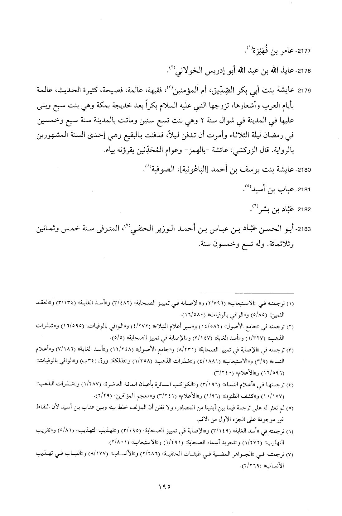 2179 - عايشة بنت أبي بكر الصِّدِّيق، أم المؤمنين (¬3)، فقيهة، عالمة، فصيحة، كثيرة الحديث، عالمة بأيام العرب وأشعارها، تزوجها النبي -عليه السلام- بكراً بعد خديجة بمكة وهي بنت سبع وبنى عليها في المدينة في شوال سنة 2 وهي بنت تسع سنين وماتت بالمدينة سنة سبع وخمسين في رمضان ليلة الثلاثاء وأمرت أن تدفن ليلاً، فدفنت بالبقيع وهي إحدى الستة المشهورين بالرواية. قال الزركشي: عائشة -بالهمز- وعوام المُحَدِّثين يقرؤنه بياء.