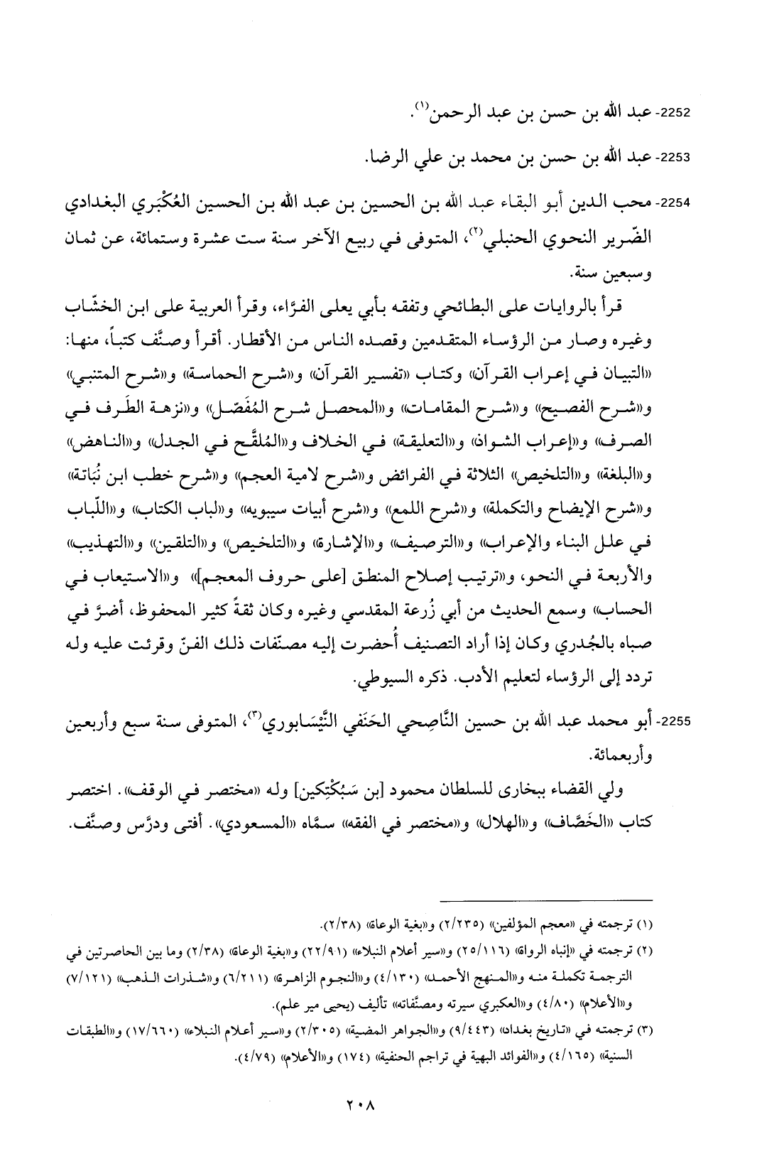 2254 - محب الدين أبو البقاء عبد الله بن الحسين بن عبد الله بن الحسين العُكْبَري البغدادي الضّرير النحوي الحنبلي (¬2)، المتوفى في ربيع الآخر سنة ست عشرة وستمائة، عن ثمان وسبعين سنة.