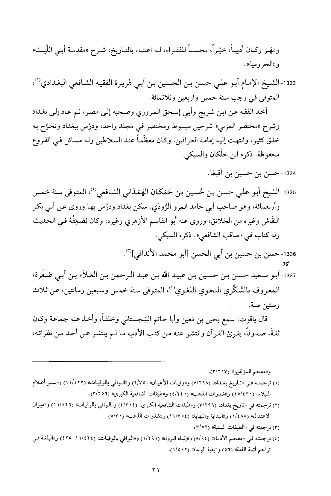 1335 - الشيخ أبو علي حسن بن حُسين بن حَمَكَان الهَمْدَاني الشافعي (¬2)، المتوفى سنة خمس وأربعمائة، وهو صاحب أبي حامد المرو الرُّوذي. سكن بغداد ودرَّس بها وروى عن أبي بكر النقّاش وغيره من الخلائق، وروى عنه أبو القاسم الأزهري وغيره، وكان يُضَعِّفُهُ في الحديث وله كتاب في "مناقب الشافعي". ذكره السبكي.