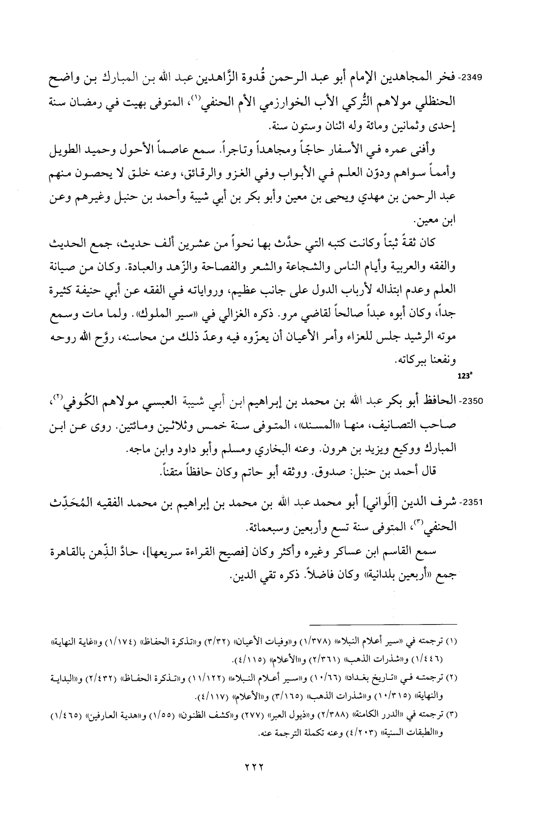 2349 - فخر المجاهدين الإمام أبو عبد الرحمن قُدوة الزَّاهدين عبد الله بن المبارك بن واضح الحنظلي مولاهم التُّركي الأب الخوارزمي الأم الحنفي (¬1)، المتوفى بهيت في رمضان سنة إحدى وثمانين ومائة وله اثنان وستون سنة.