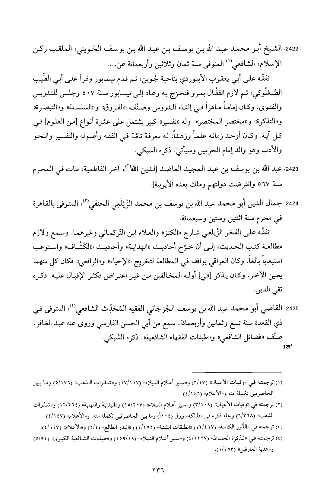 2422 - الشيخ أبو محمد عبد الله بن يوسف بن عبد الله بن يوسف الجُوَيني، الملقب ركن الإسلام، الشافعي (¬1) المتوفى سنة ثمان وثلاثين وأربعمائة عن ....