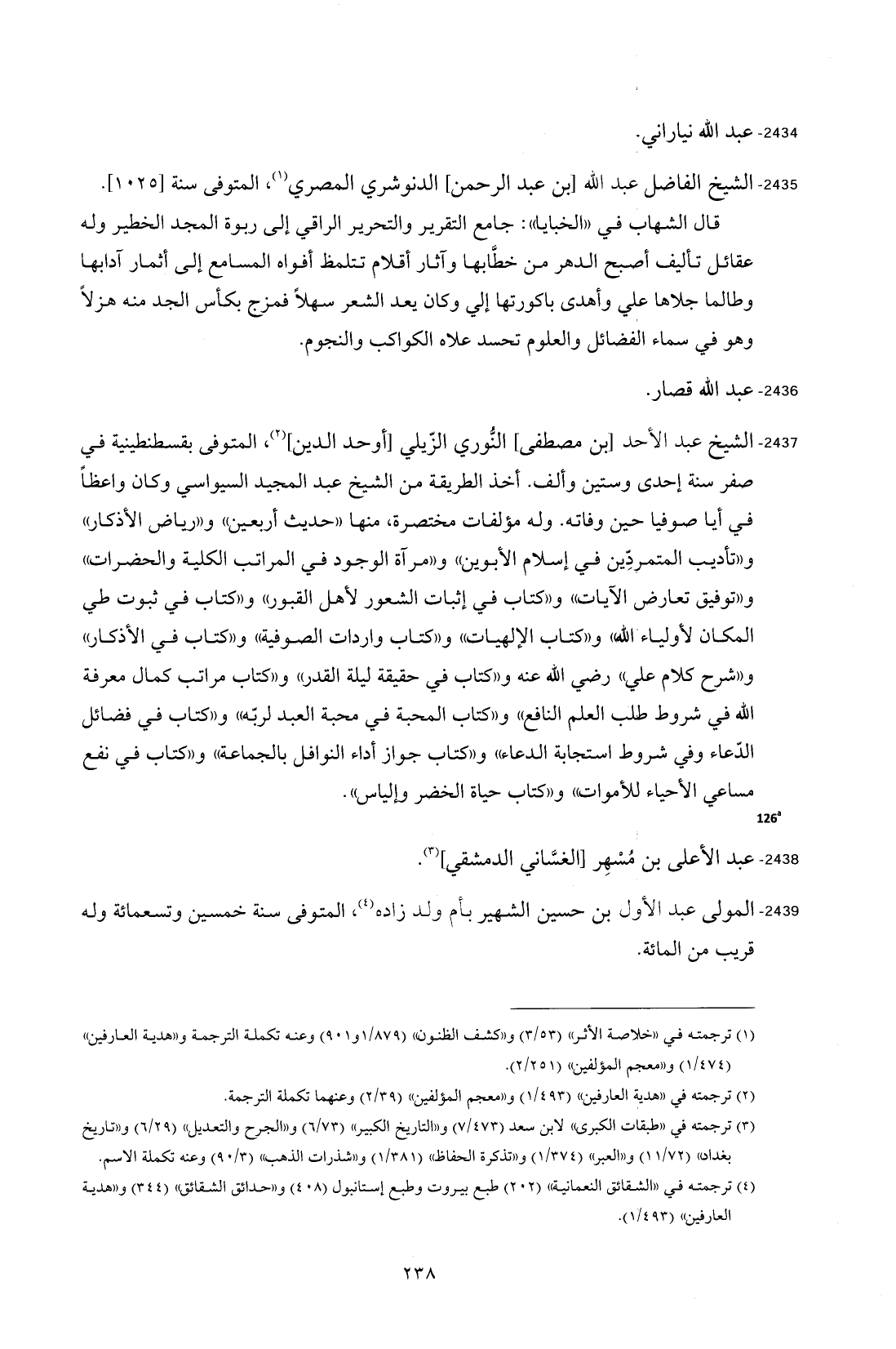 2437 - الشيخ عبد الأحد [بن مصطفى] النُّوري الزّيلي [أوحد الدين] (¬2)، المتوفى بقسطنطينية في صفر سنة إحدى وستين وألف. أخذ الطريقة من الشيخ عبد المجيد السيواسي وكان واعظًا في أيا صوفيا حين وفاته. وله مؤلفات مختصرة، منها "حديث أربعين" و"رياض الأذكار" و"تأديب المتمردِّين في إسلام الأبوين" و"مرآة الوجود في المراتب الكلية والحضرات" و"توفيق تعارض الآيات" و"كتاب في إثبات الشعور لأهل القبور" و"كتاب في ثبوت طي المكان لأولياء الله" و"كتاب الإلهيات" و"كتاب واردات الصوفية" و"كتاب في الأذكار" و"شرح كلام علي" -رضي الله عنه- و"كتاب في حقيقة ليلة القدر" و"كتاب مراتب كمال معرفة الله في شروط طلب العلم النافع" و"كتاب المحبة في محبة العبد لربّه" و"كتاب في فضائل الدّعاء وفي شروط استجابة الدعاء" و"كتاب جواز أداء النوافل بالجماعة" و"كتاب في نفع مساعي الأحياء للأموات" و"كتاب حياة الخضر وإلياس".