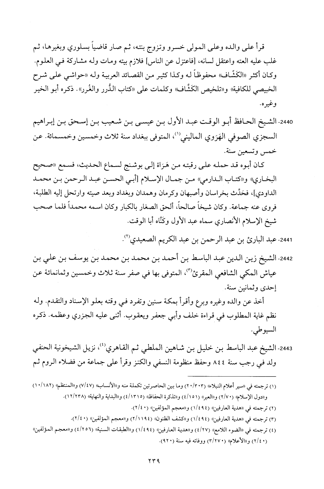 2440 - الشيخ الحافظ أبو الوقت عبد الأول بن عيسى بن شعيب بن إسحق بن إبراهيم السجزي الصوفي الهَرَوي الماليني (¬1)، المتوفى ببغداد سنة ثلاث وخمسين وخمسمائة. عن خمس وتسعين سنة.