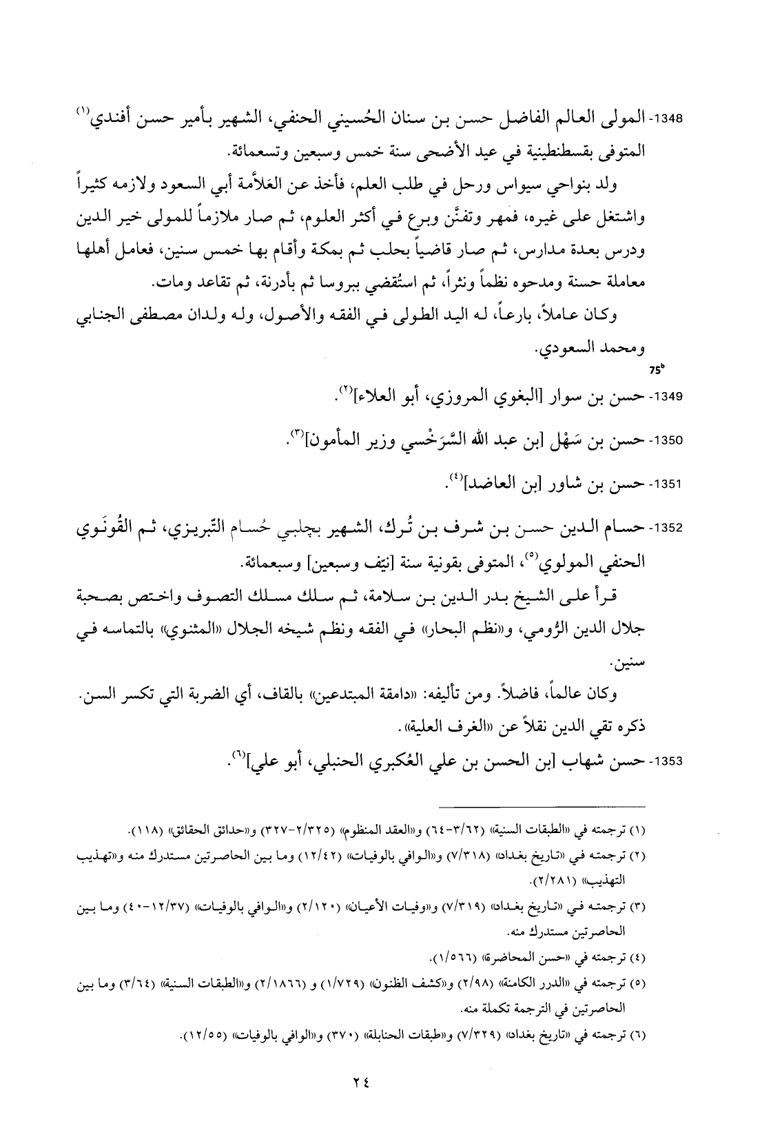 1348 - المولى العالم الفاضل حسن بن سنان الحُسيني الحنفي، الشهير بأمير حسن أفندي (¬1) المتوفى بقسطنطينية في عيد الأضحى سنة خمس وسبعين وتسعمائة.