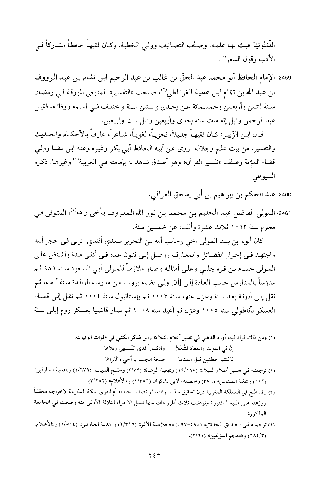 2459 - الإمام الحافظ أبو محمد عبد الحقّ بن غالب بن عبد الرحيم ابن تَمَّام بن عبد الرؤوف بن عبد الله بن تمّام ابن عطية الغرناطي (¬2)، صاحب "التفسير" المتوفى بلورقة في رمضان سنة ثنتين وأربعين وخمسمائة عن إحدى وستين سنة واختلف في اسمه ووفاته، فقيل عبد الرحمن وقيل إنه مات سنة إحدى وأربعين وقيل ست وأربعين.
