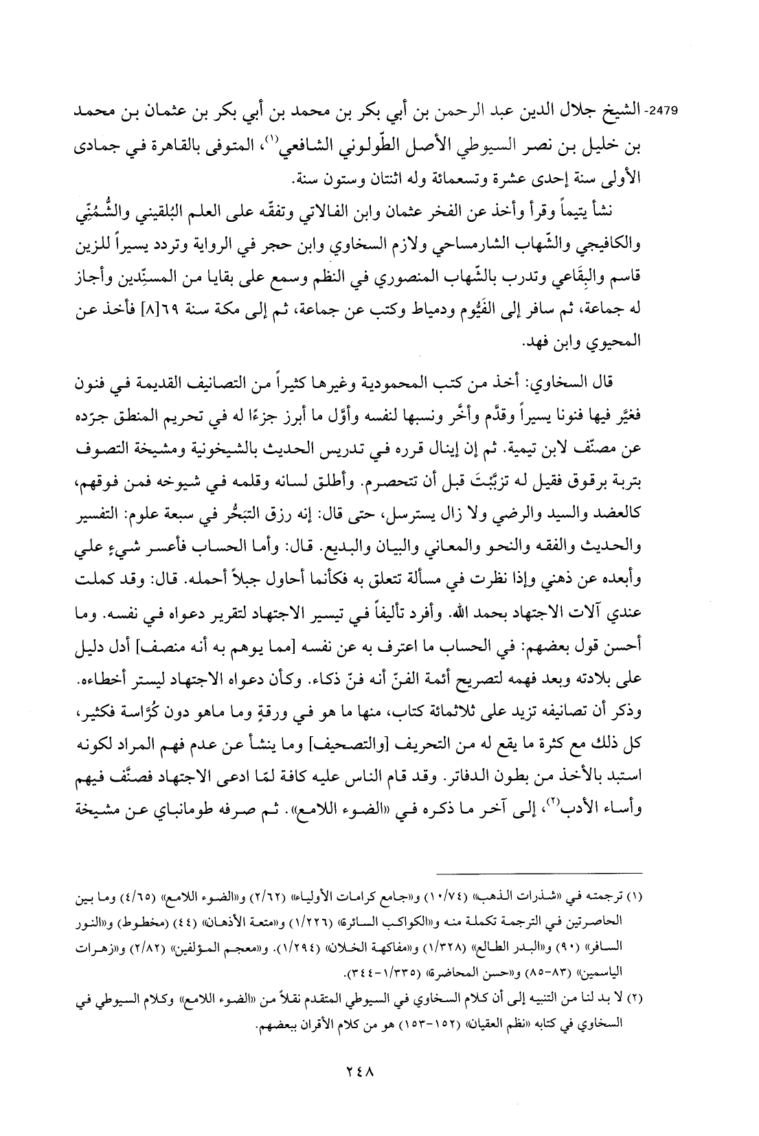 (¬2) لا بد لنا من التنبيه إلى أن كلام السخاوي في السيوطي المتقدم نقلًا من "الضوء اللامع" وكلام السيوطي في السخاوي في كتابه "نظم العقيان" (152 - 153) هو من كلام الأقران ببعضهم.